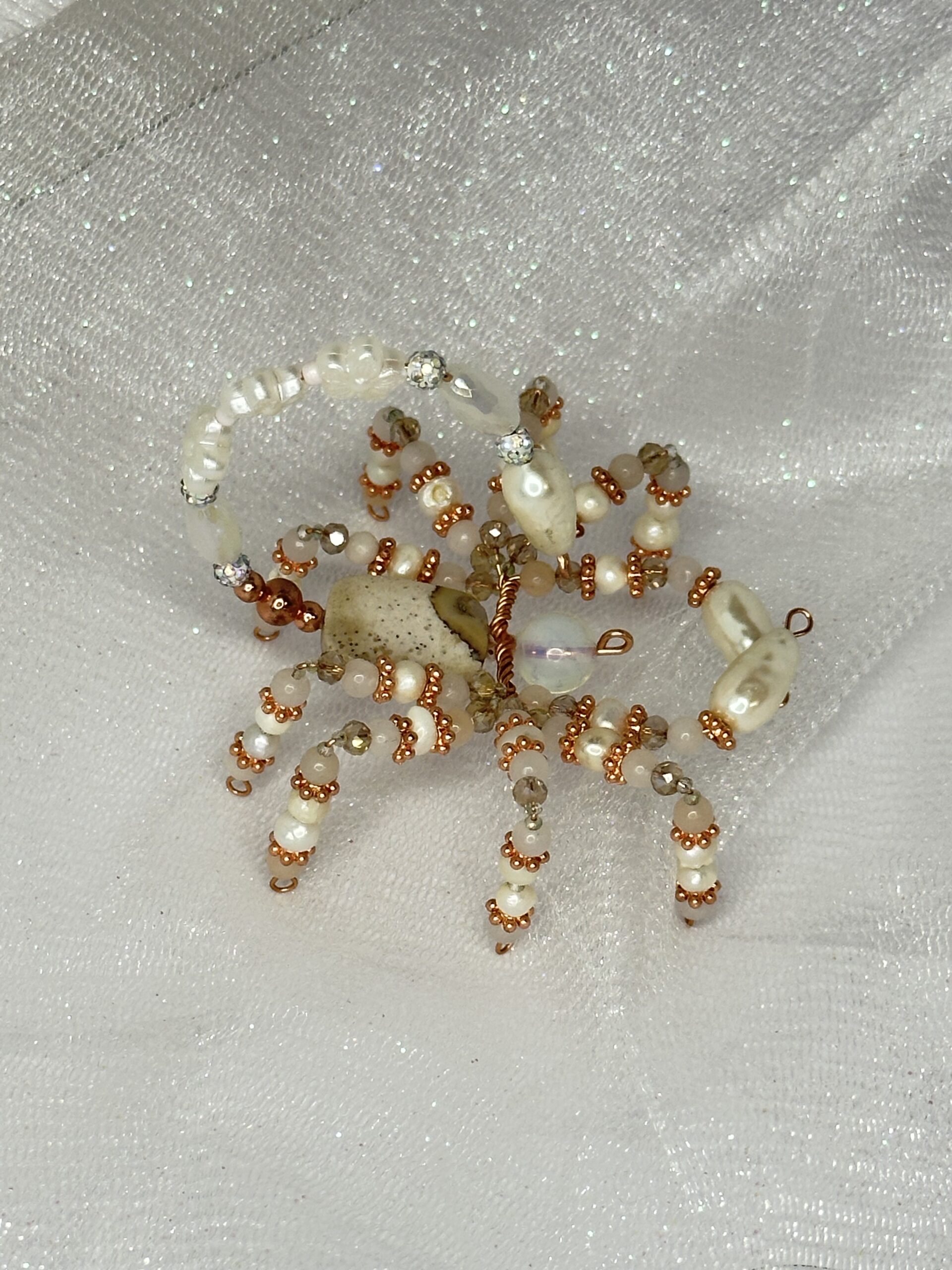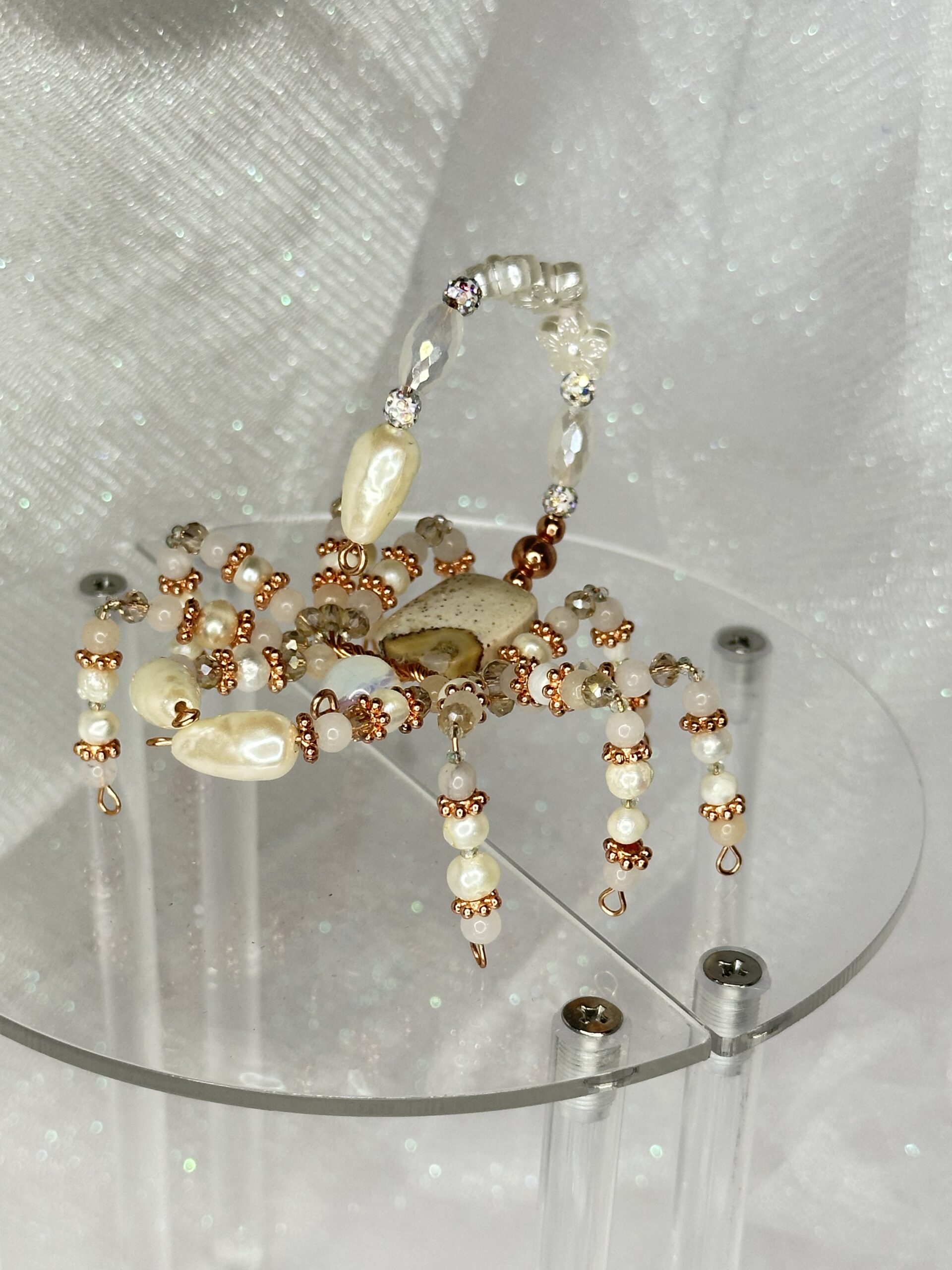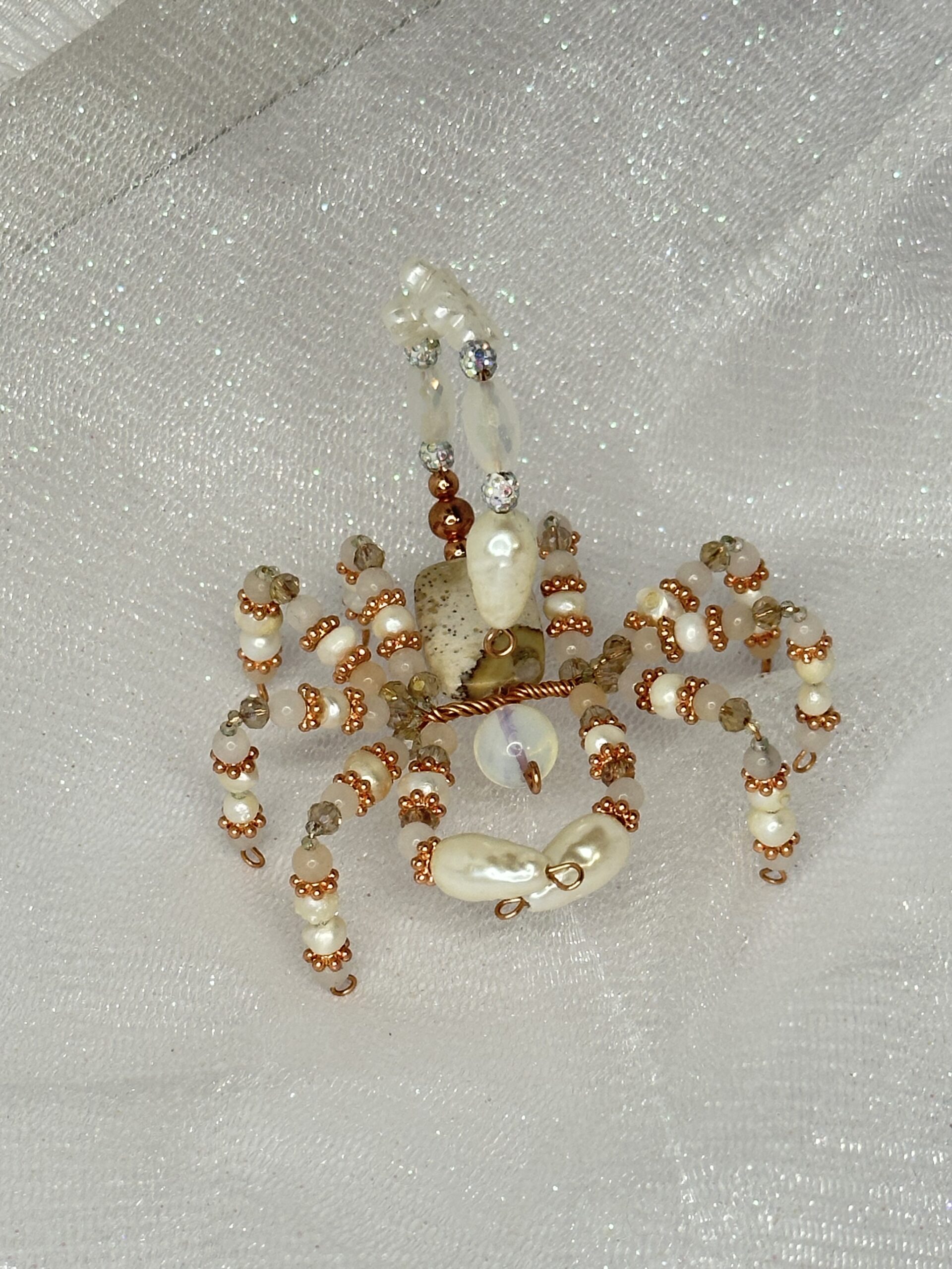 Introducing Adeline, a meticulously handcrafted beaded scorpion that effortlessly combines whimsy and elegance. Created using copper-toned wire and an exquisite array of beads, Adeline stands out as a piece of artistry, bringing both character and refinement to your space. With her delicate pincers, a body of flower agate and opalite, and legs with freshwater pearl, pink aventurine, and glass, she’s a stunning embodiment of craftsmanship and creative design. Whether placed on your desk at work, perched on a bookshelf at home, or adding personality to your car’s dashboard, she becomes an eye-catching accent no matter where she resides. Her copper-toned design lends a warm and inviting aesthetic, making her the perfect addition for those who appreciate handmade art with a whimsical yet feminine touch.