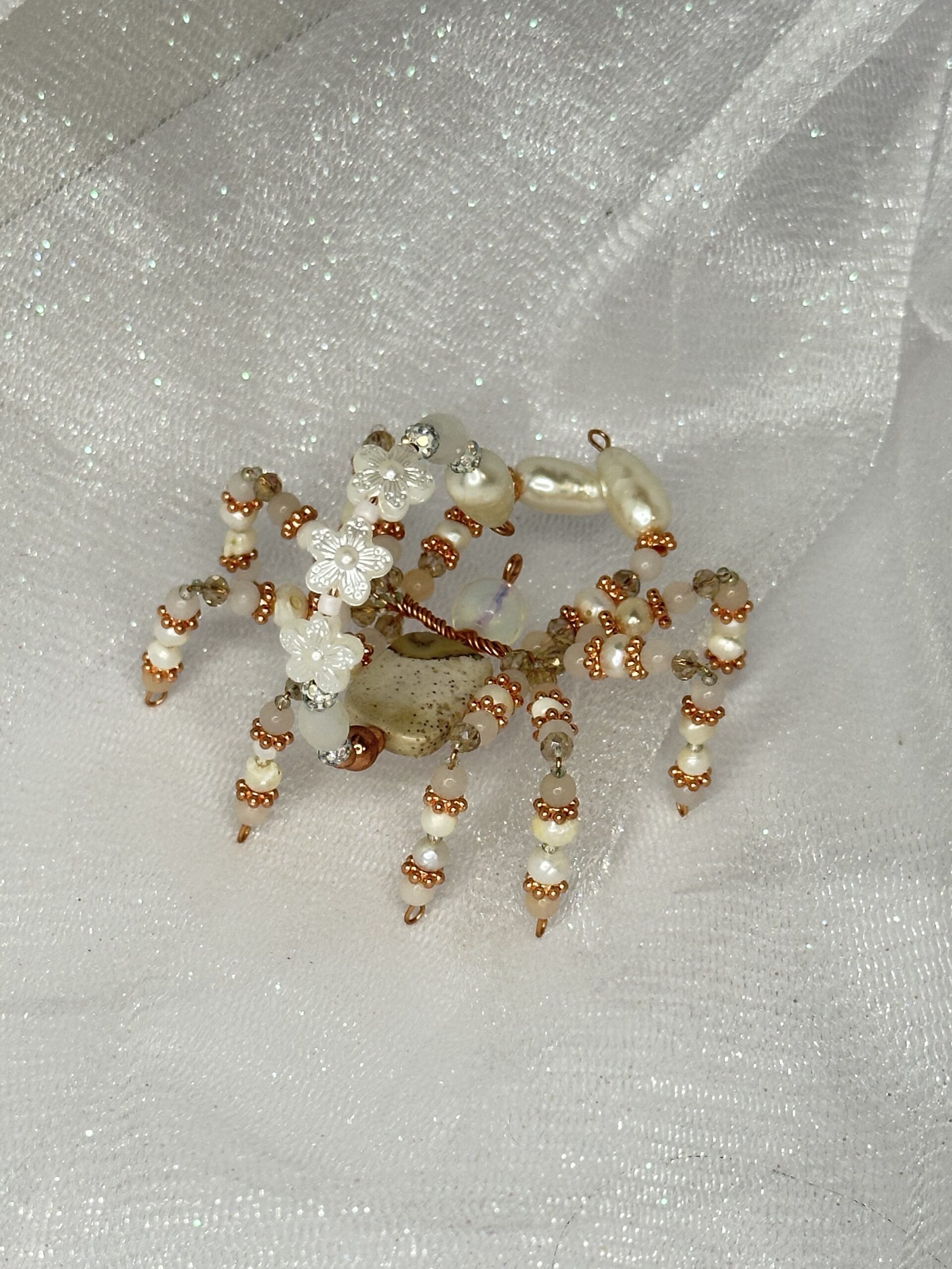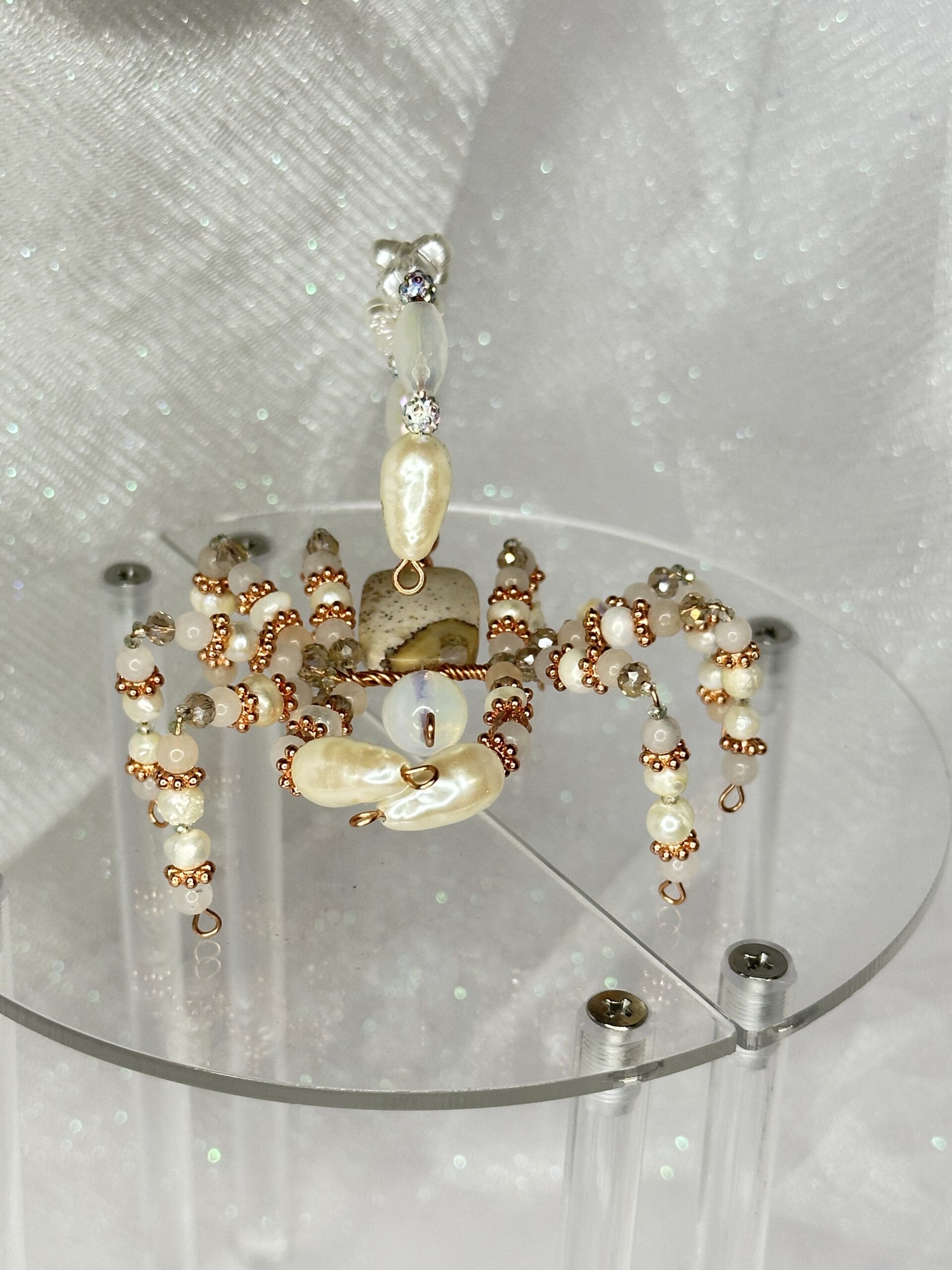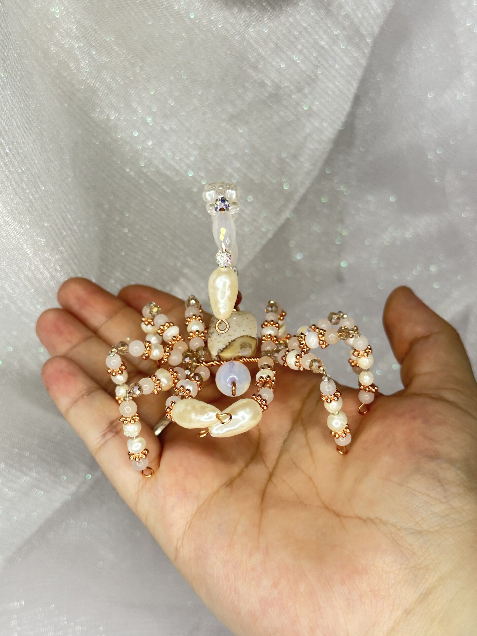 Introducing Adeline, a meticulously handcrafted beaded scorpion that effortlessly combines whimsy and elegance. Created using copper-toned wire and an exquisite array of beads, Adeline stands out as a piece of artistry, bringing both character and refinement to your space. With her delicate pincers, a body of flower agate and opalite, and legs with freshwater pearl, pink aventurine, and glass, she’s a stunning embodiment of craftsmanship and creative design. Whether placed on your desk at work, perched on a bookshelf at home, or adding personality to your car’s dashboard, she becomes an eye-catching accent no matter where she resides. Her copper-toned design lends a warm and inviting aesthetic, making her the perfect addition for those who appreciate handmade art with a whimsical yet feminine touch.