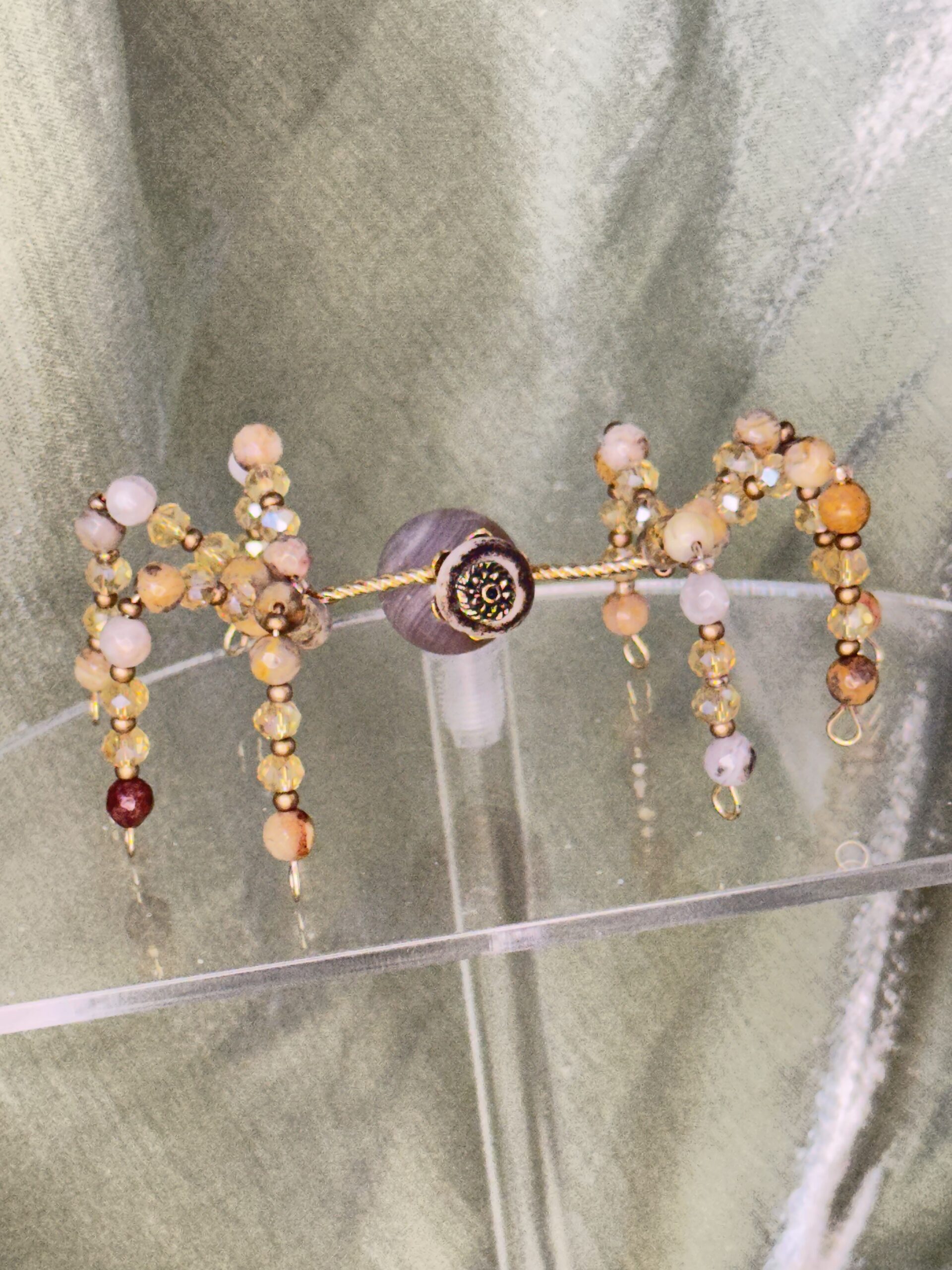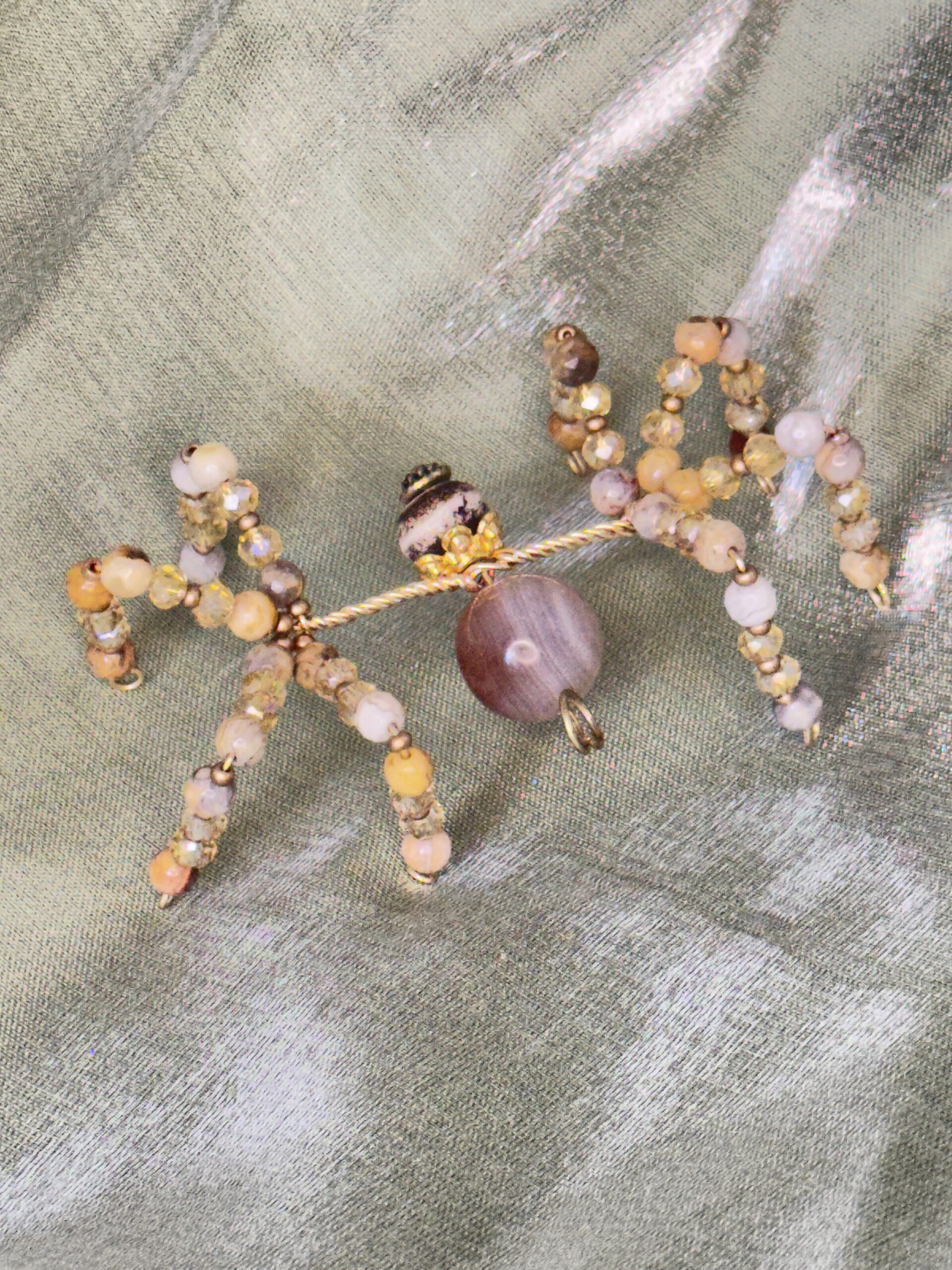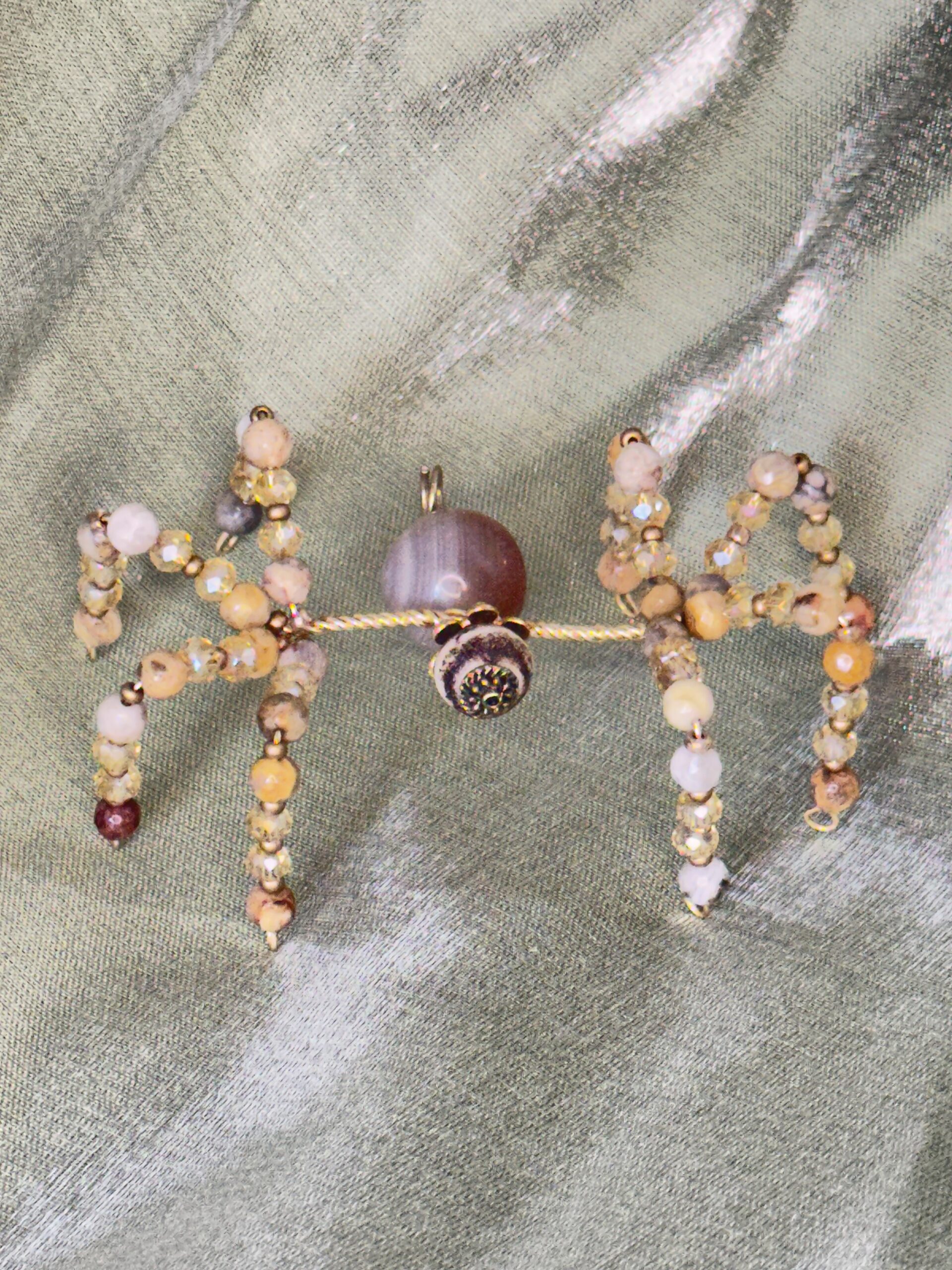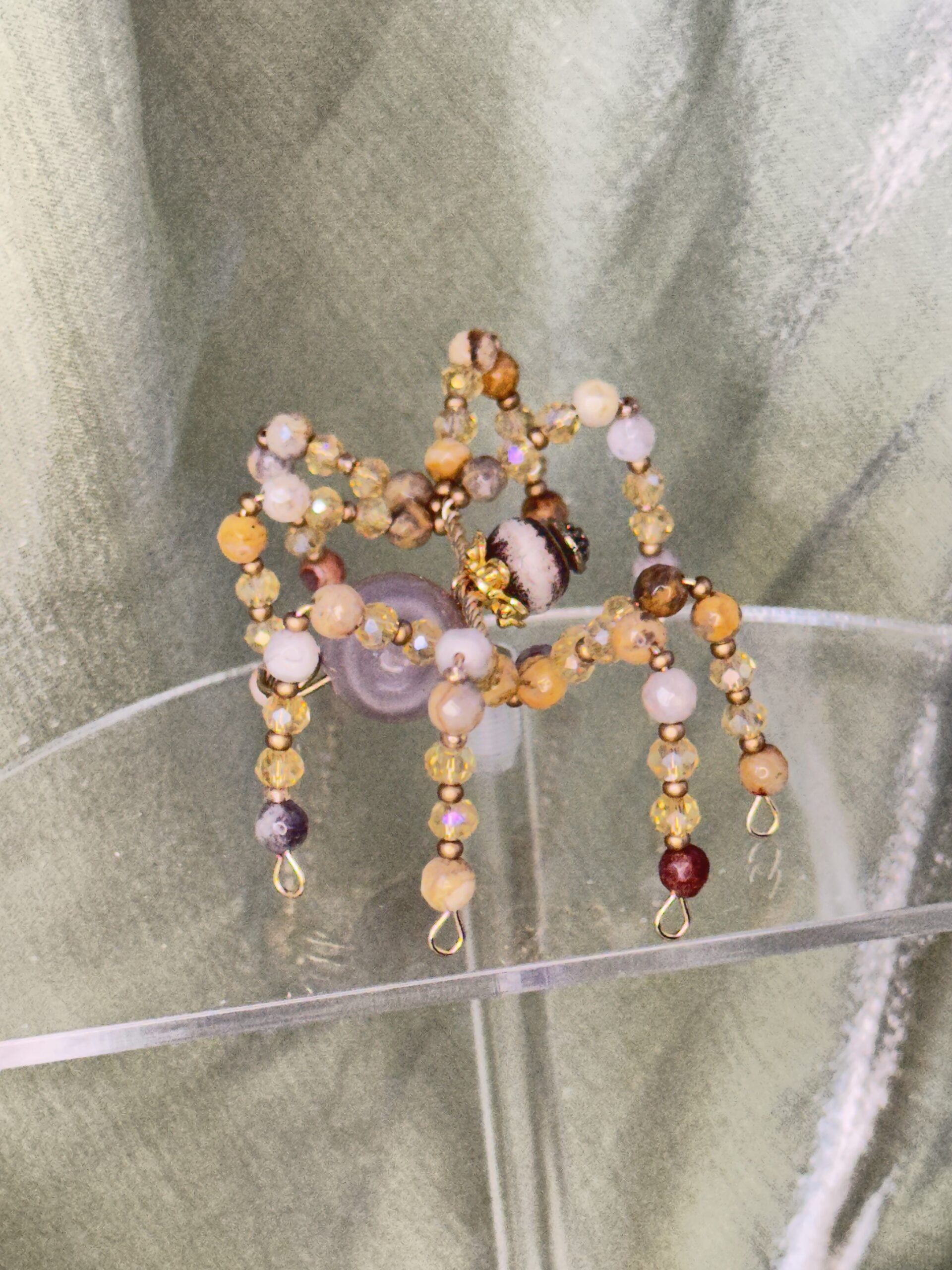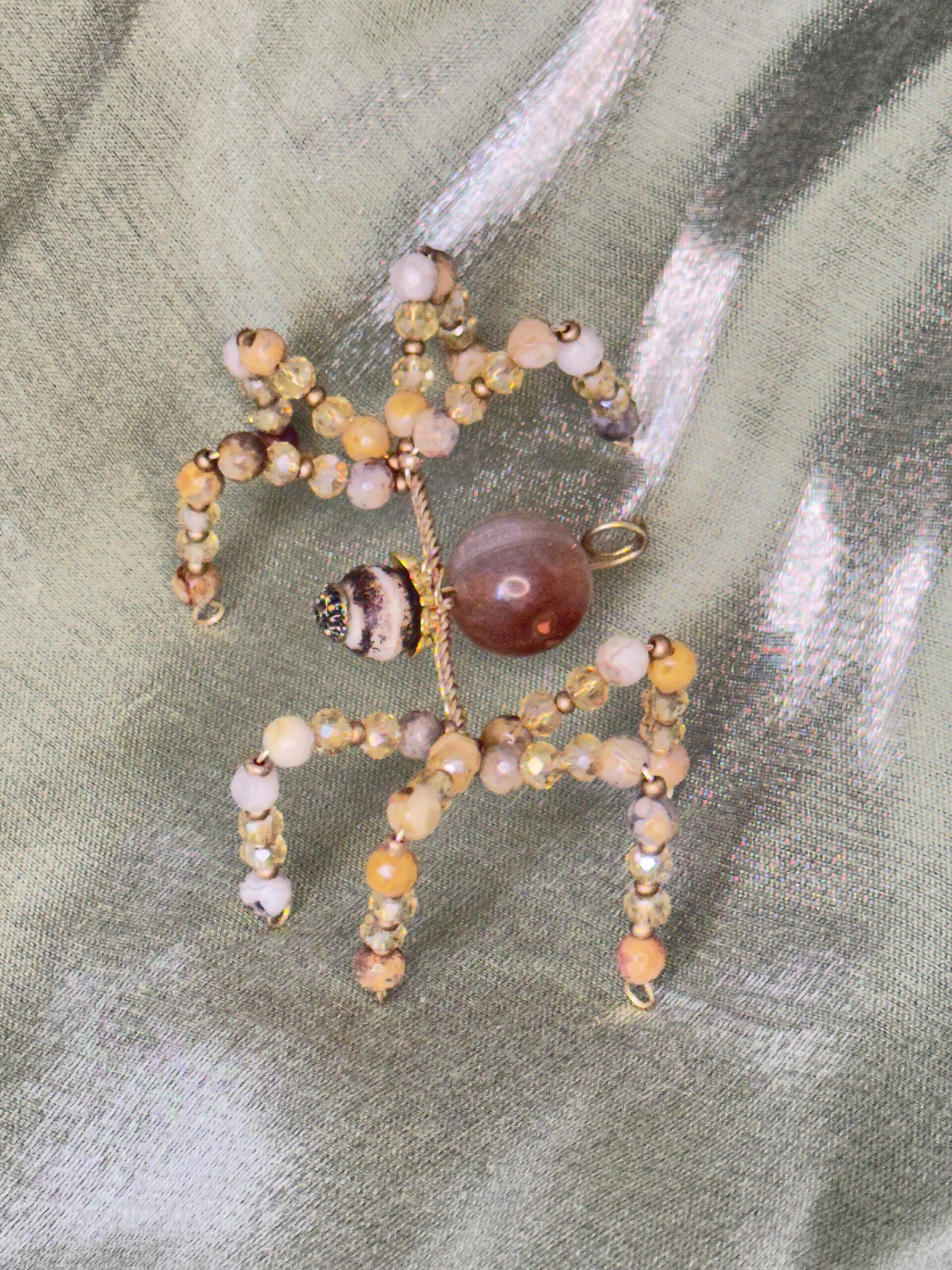 Introducing Amber, a medium handmade beaded spider that captivates with its delicate craftsmanship and sophisticated design. Made with a thoughtful combination of agate, bone, Chinese crystal, and gold-tone wire, Amber is a testament to the fusion of elegance and artistic expression. Place her on a desk or shelf for an instant touch of elegance that complements your home or office environment. Amber’s presence isn’t restricted to indoor spaces; her intricate detailing makes her a perfect companion for your car, injecting personality and charm. If you’re decorating for the holidays, Amber effortlessly transforms into a festive ornament that can be hung from a Christmas tree or any seasonal display. For those seeking wearable art, Amber can be attached to a necklace chain, becoming a truly unique accessory that highlights your individuality.