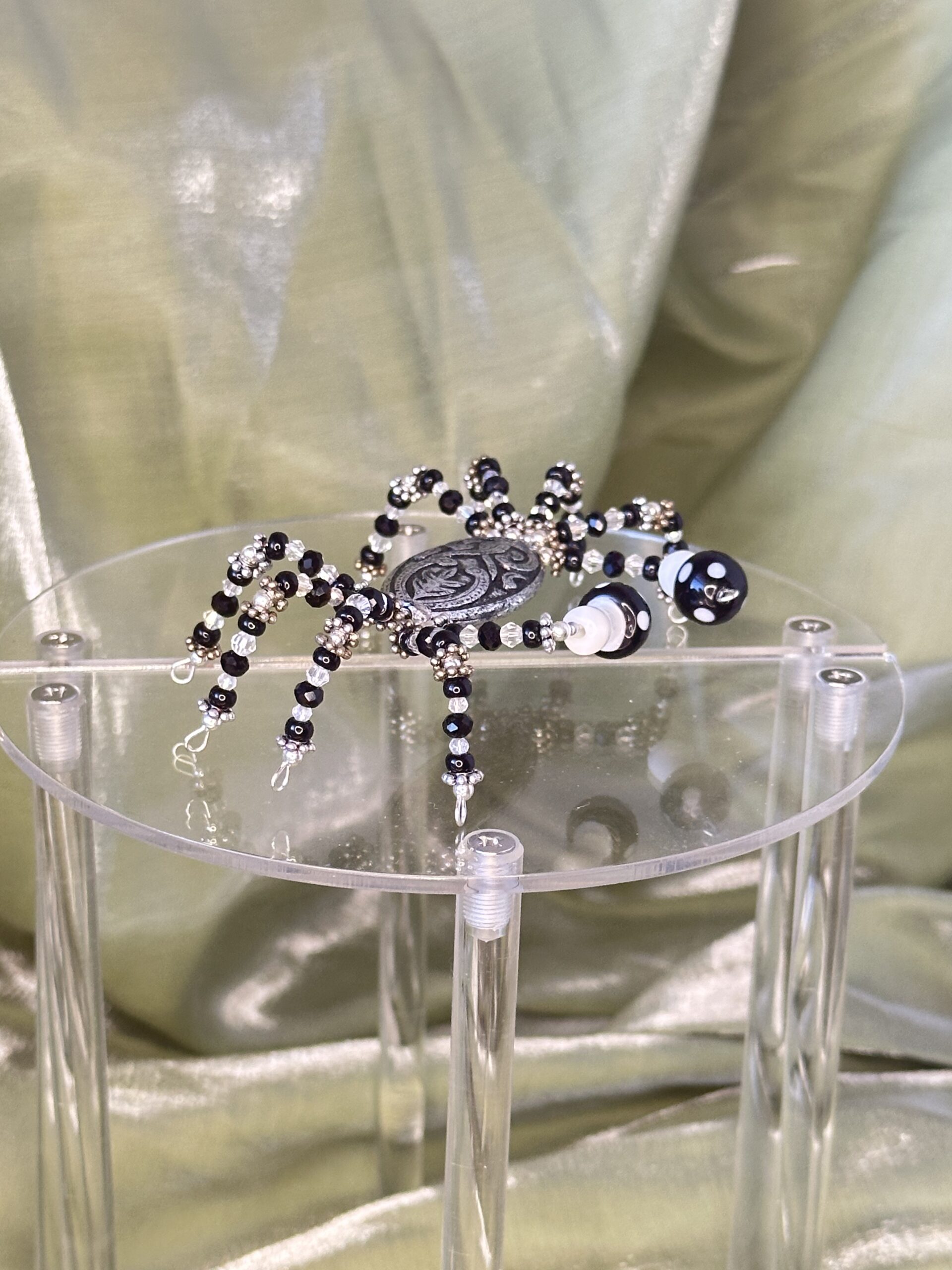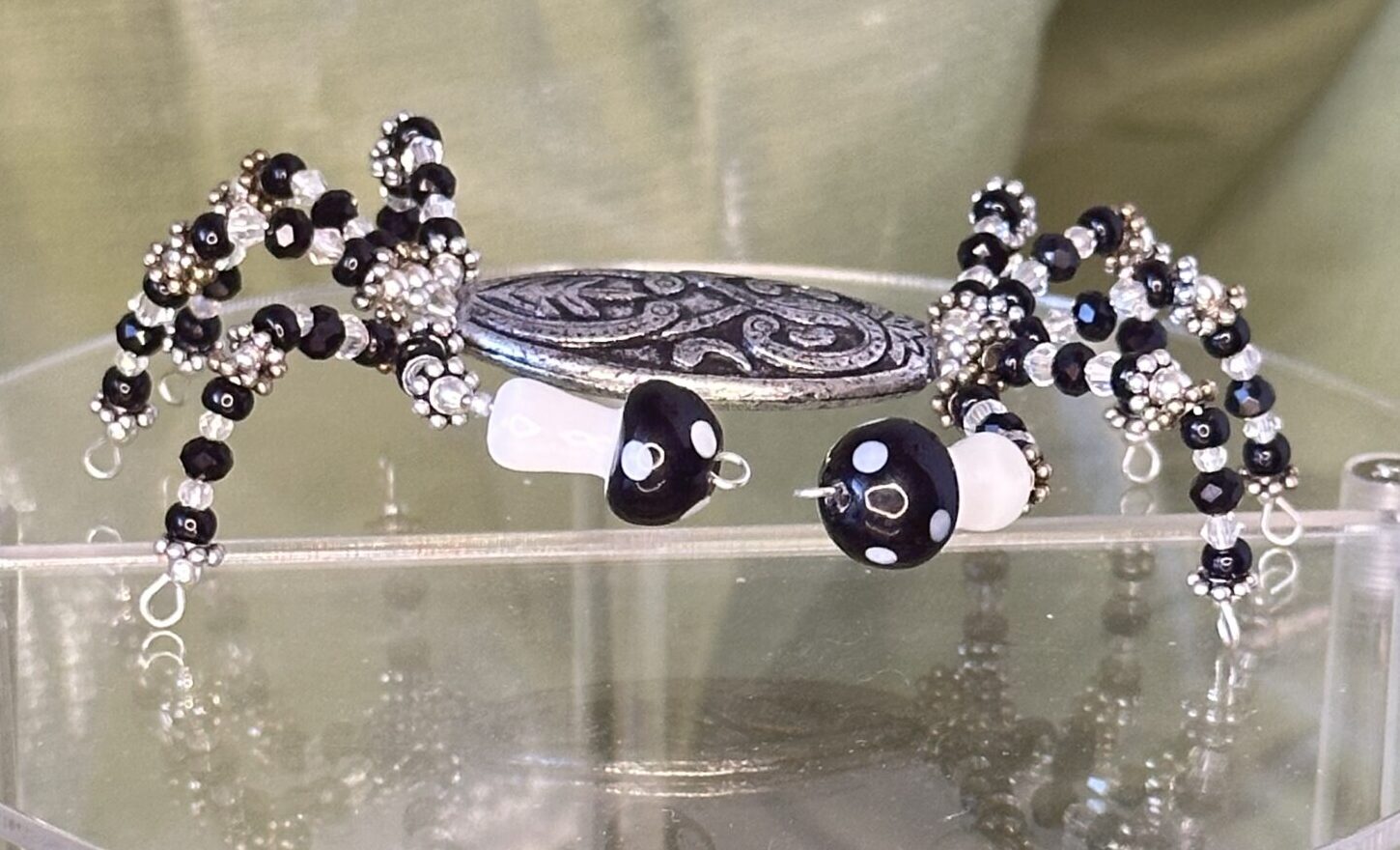Meet this charming little crab, handcrafted with exquisite Chinese crystal beads and adorned with delightful glass mushroom pincers for a touch of whimsy. Its black, silver, and white hues create a versatile and elegant décor piece that complements any room in your home, from the coastal-themed living room to a serene bedroom space.