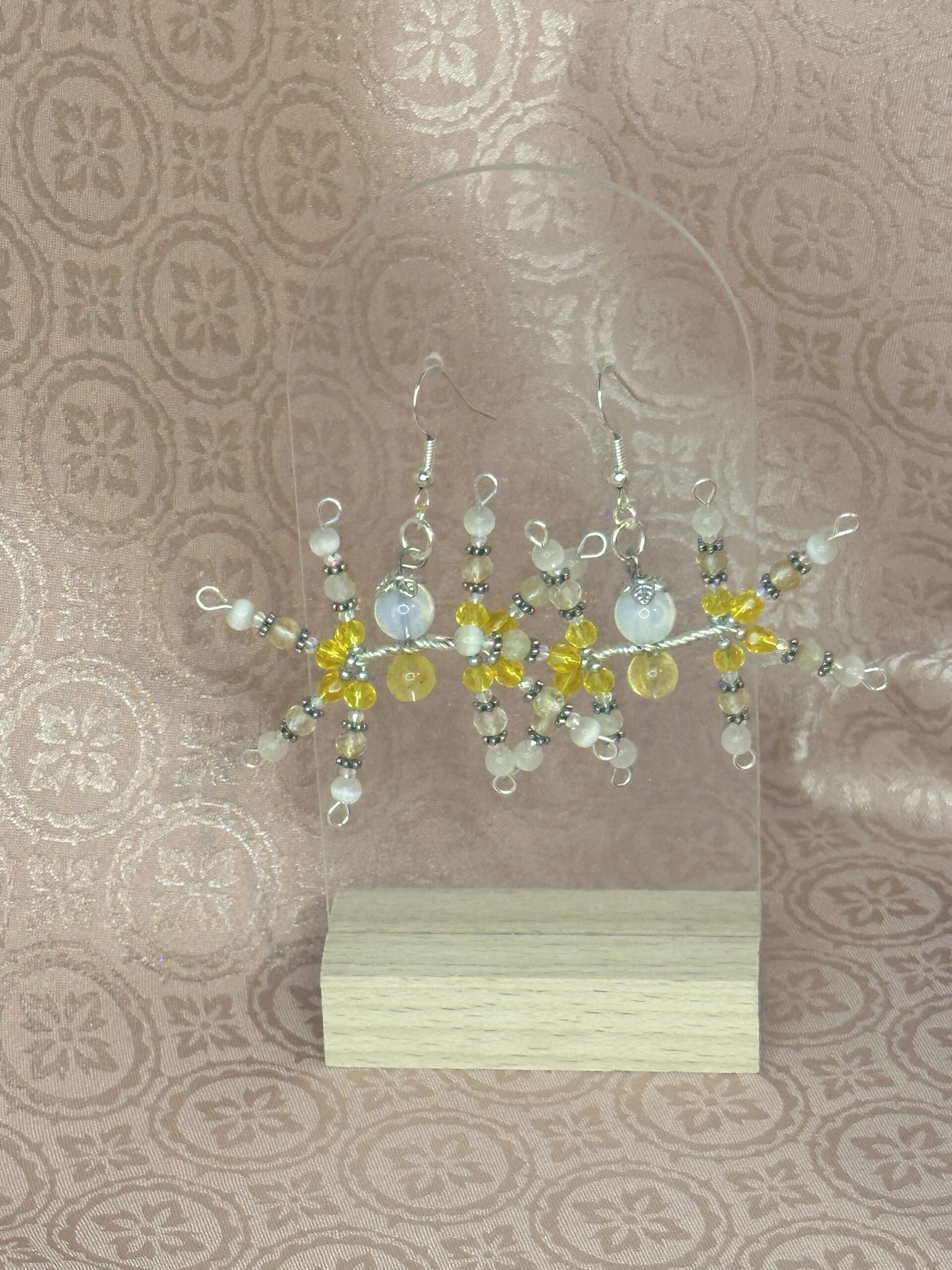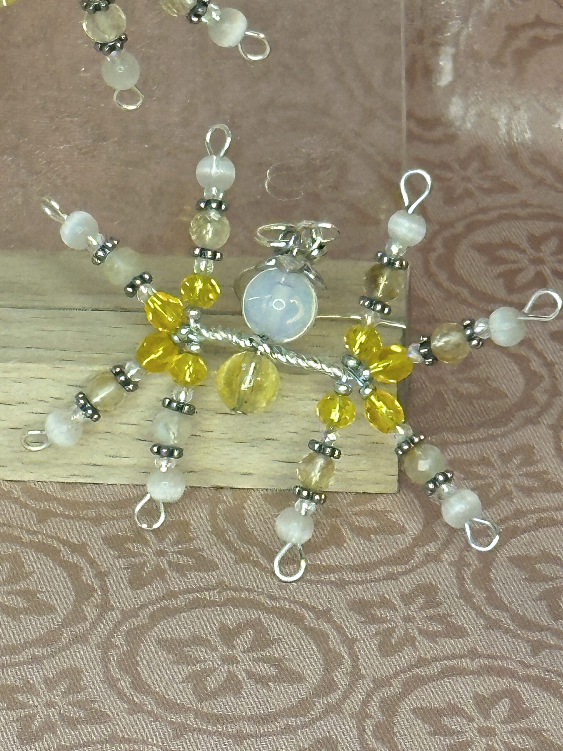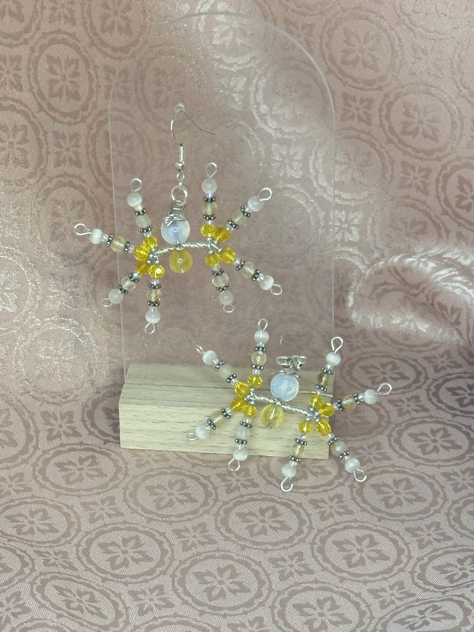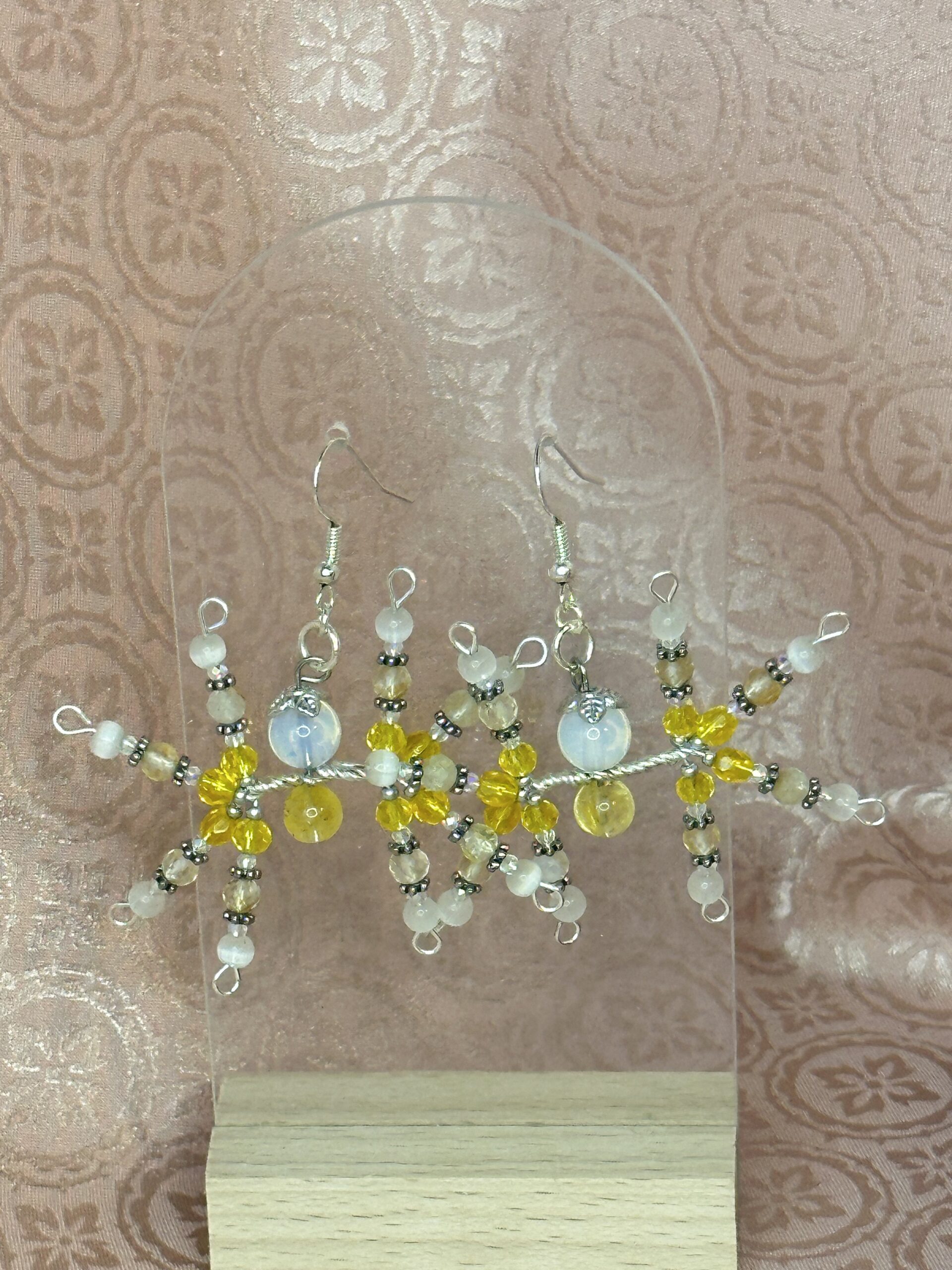 Looking for an accessory that combines individuality and elegance with a touch of eccentricity? Meet Dylan and Cole—handmade spider earrings designed to captivate and amaze. Perfect for those who love the extraordinary, these earrings showcase a thoughtful blend of unique craftsmanship and bold design, making them a standout addition to your jewelry collection. These boys are made using citrine, opalite, and selenite. Handmade with precision, these earrings are as lightweight as they are eye-catching. Their detailed design blends a whimsical spider motif with the shimmering beauty natural stones, creating a conversation starter that pairs wonderfully with a range of looks—be it edgy, chic, or avant-garde.