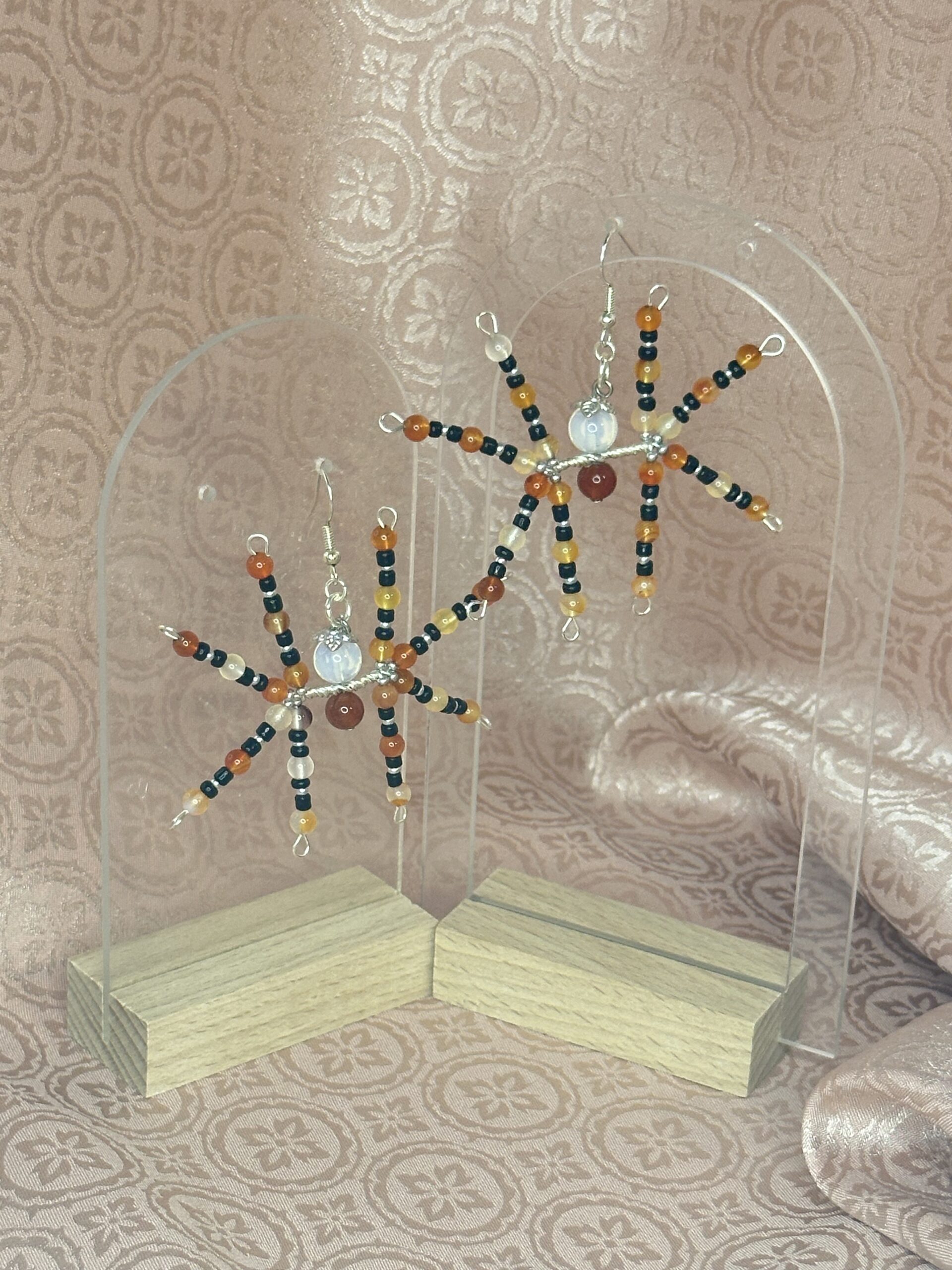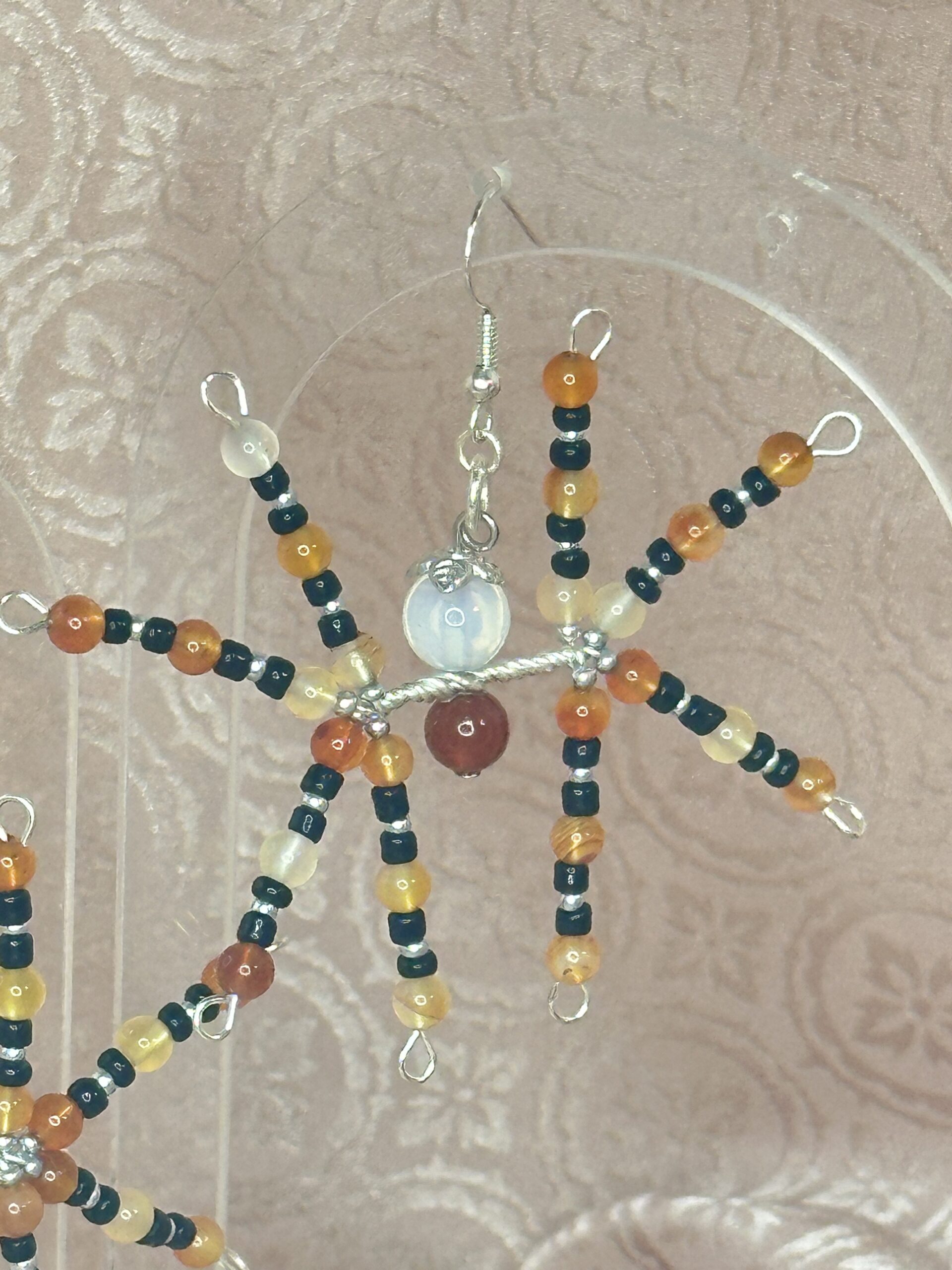 Magni and Modi, the perfect blend of artistry and seasonal charm. These earrings feature a striking silver-tone finish paired with vibrant carnelian and opalite beads, creating a bold yet versatile accessory. Their unique orange and black color palette evokes the essence of autumn, making them ideal not just for Halloween but for everyday wear. These lightweight earrings are designed to be comfortably stylish while effortlessly enhancing your outfit. Their eclectic design combines seasonal flair with year-round versatility, making them a thoughtful addition to your jewelry collection. Pair them with cozy knits, bold prints, or even formal attire to show off your personal style. Celebrate the beauty of autumn in the most creative way possible with these one-of-a-kind earrings!