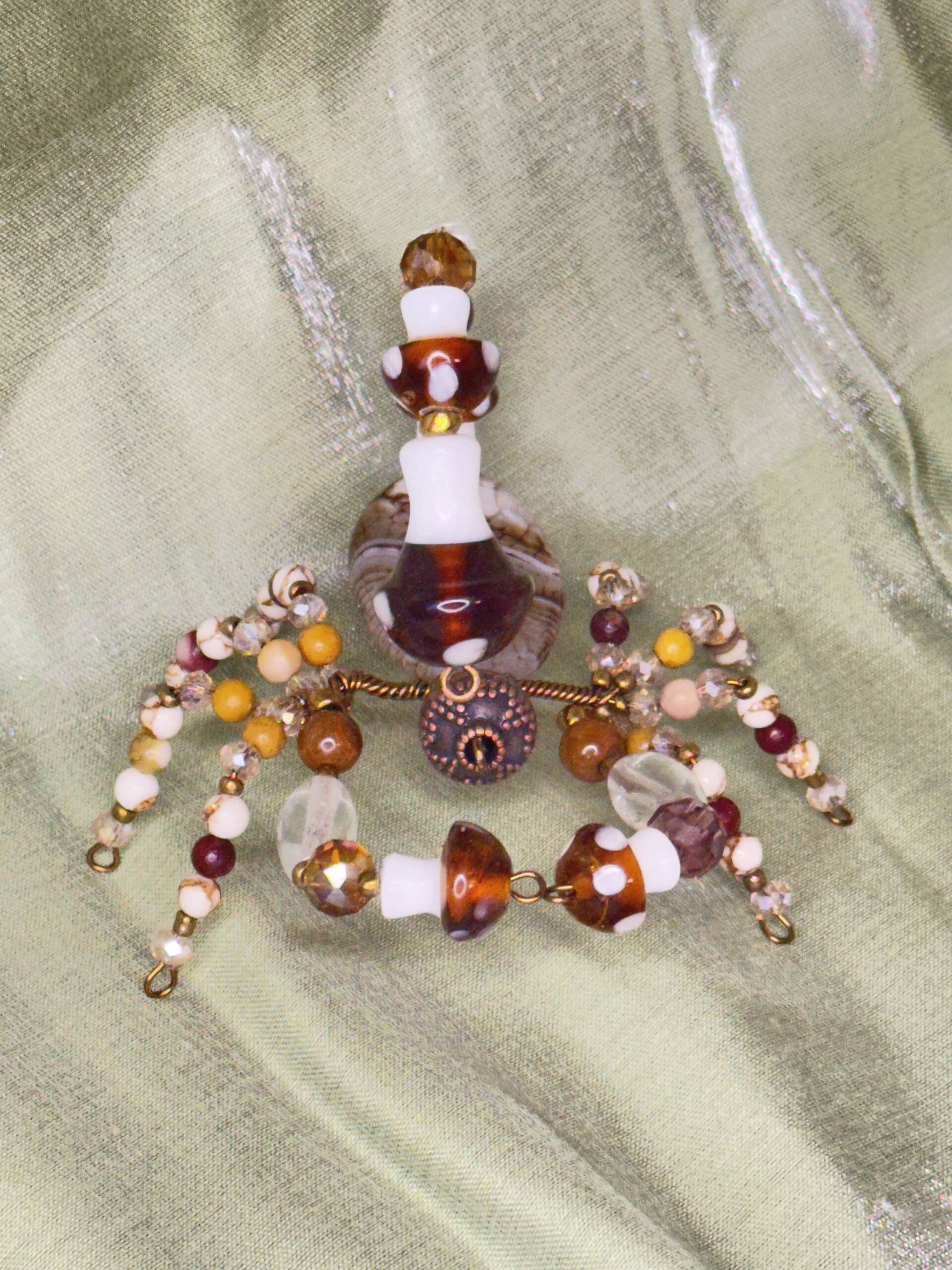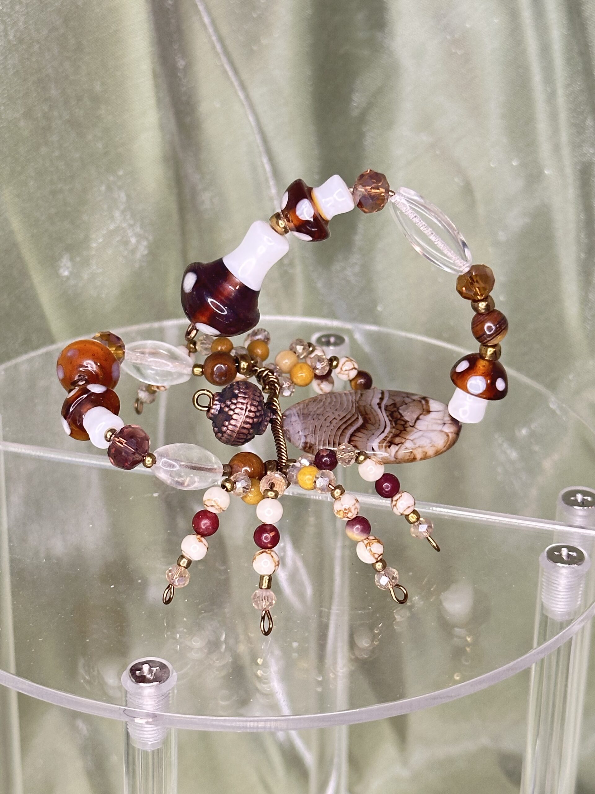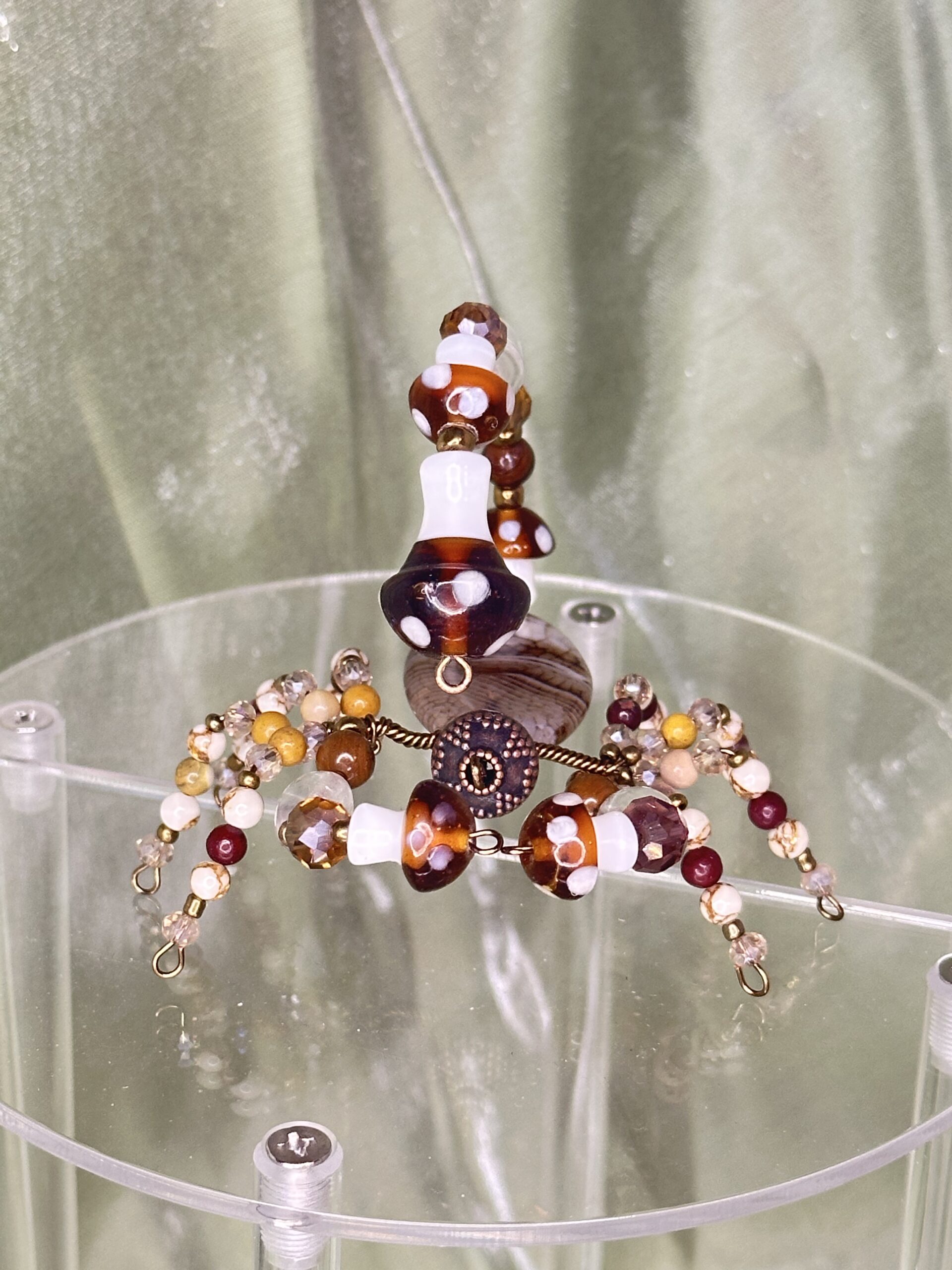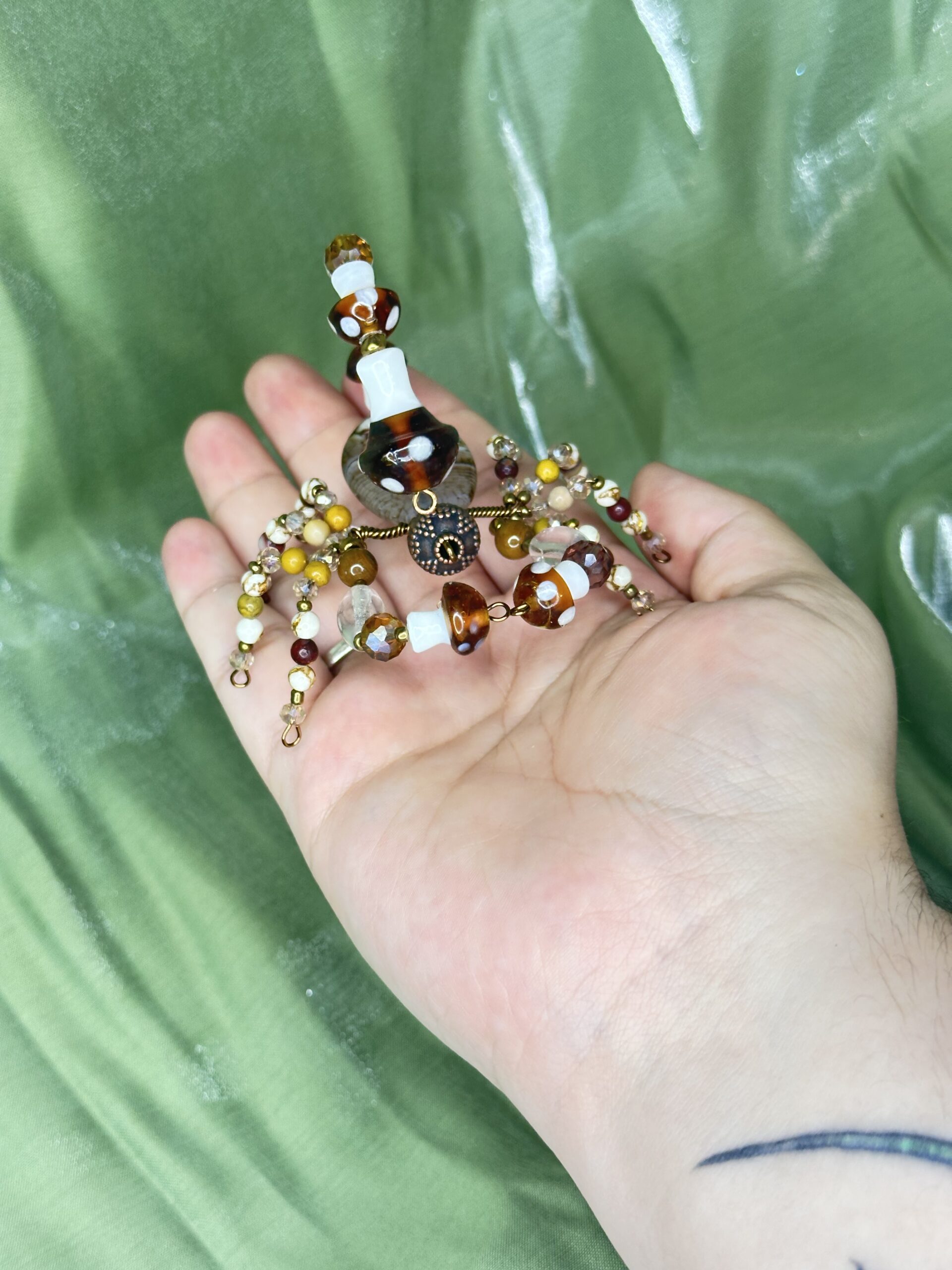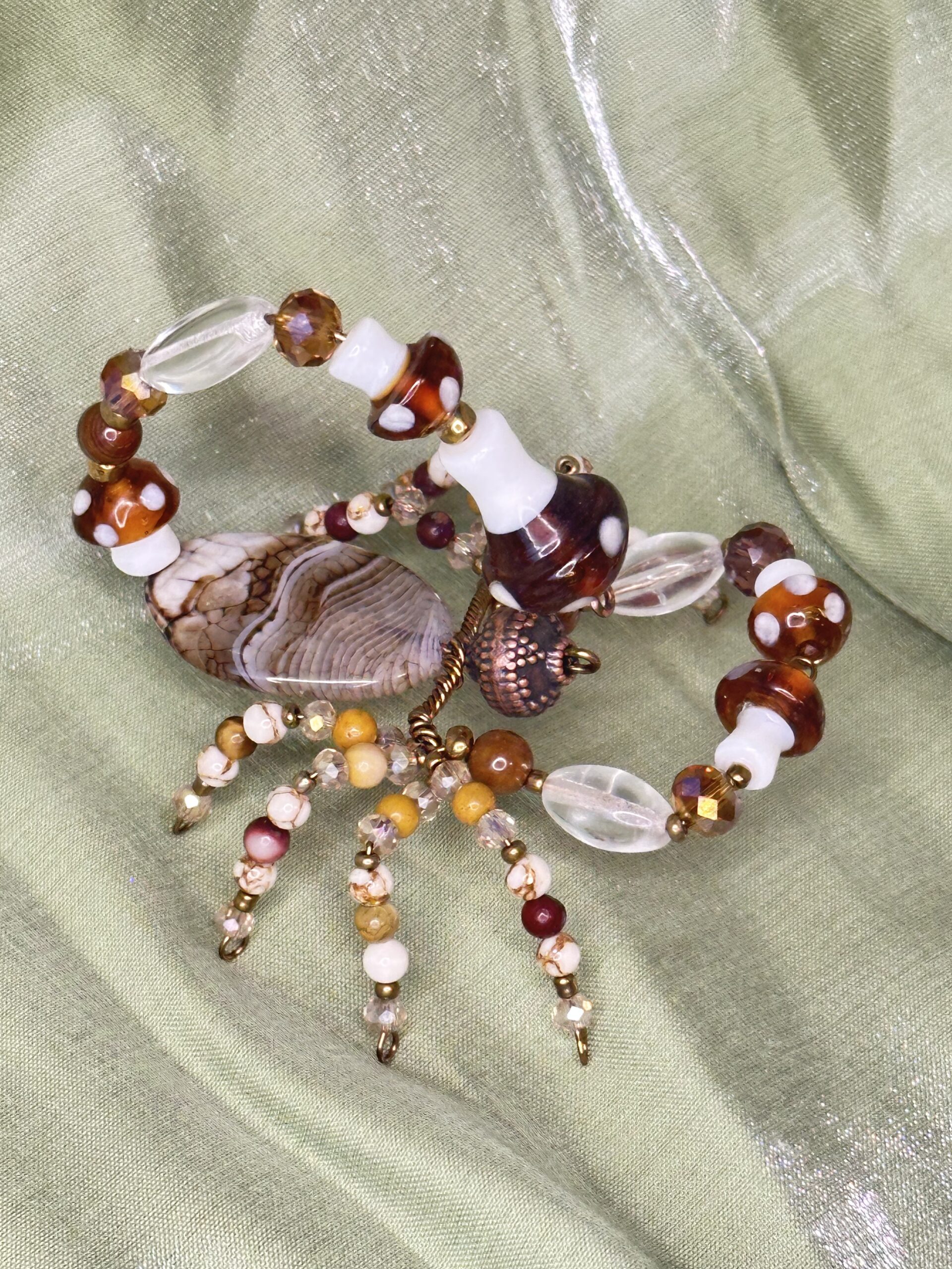 Marcus is brought to life using a thoughtfully curated selection of high-quality beads and materials. Glass beads shaped like mushrooms anchor its design, while metal beads add a sleek, modern edge. Natural gemstones such as tiger’s eye, agate, bone, golden pine jasper, and mookaite beads contribute their rich textures and earthy hues, making Marcus not just a decorative scorpion but a celebration of nature-inspired artistry. The seamless blending of these materials results in a singular piece that radiates sophistication and hand-crafted authenticity. Whether you’re drawn to the earthy aesthetic or intrigued by intricate bead-work, Marcus promises a harmonious balance of beauty and whimsy. Whether you’re gifting it to a friend or treating yourself to a whimsical accent, Marcus is a delightful decor companion with universal appeal.