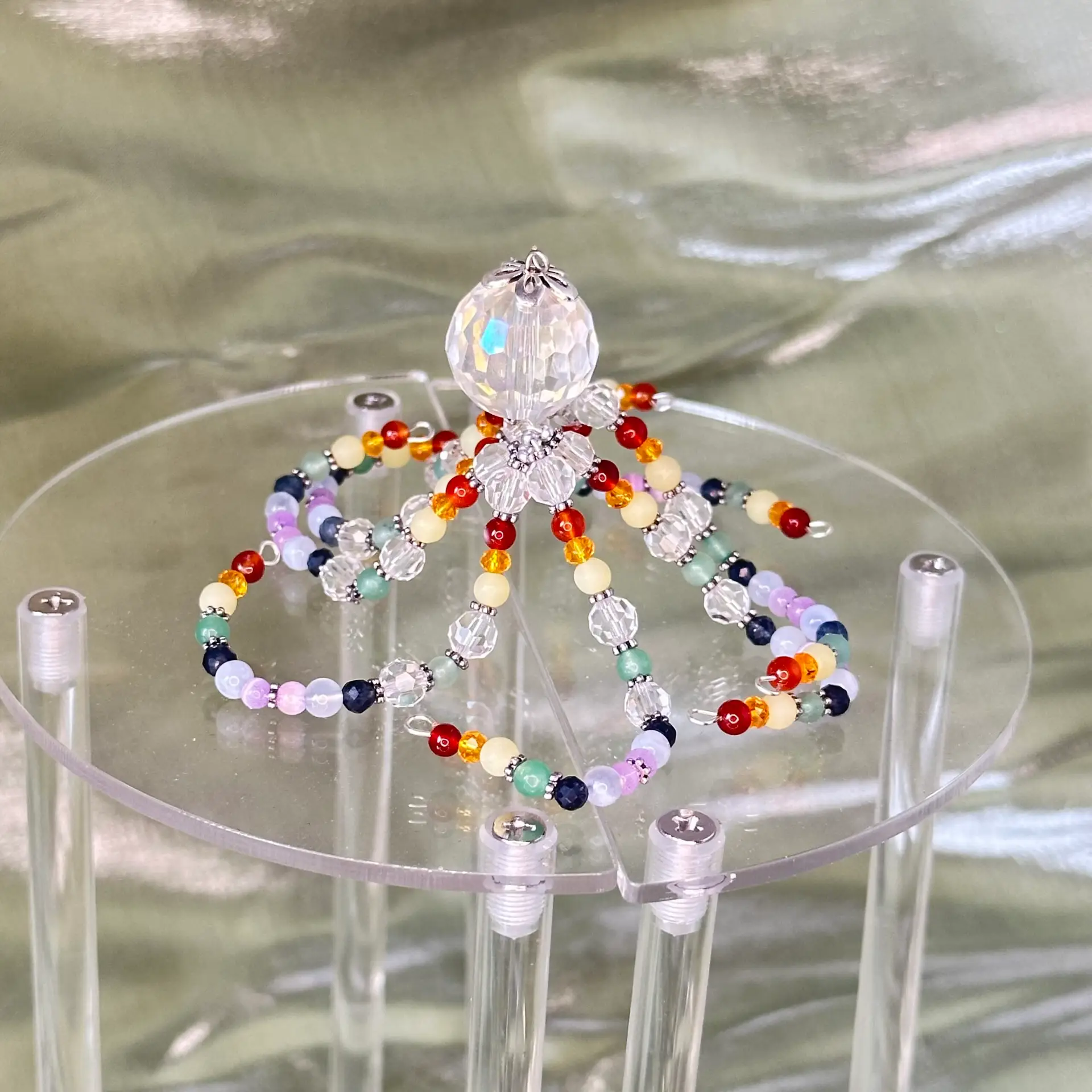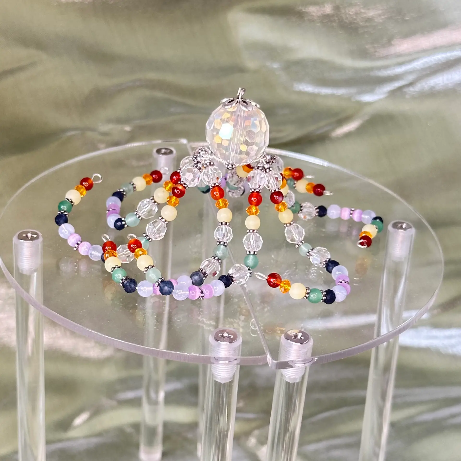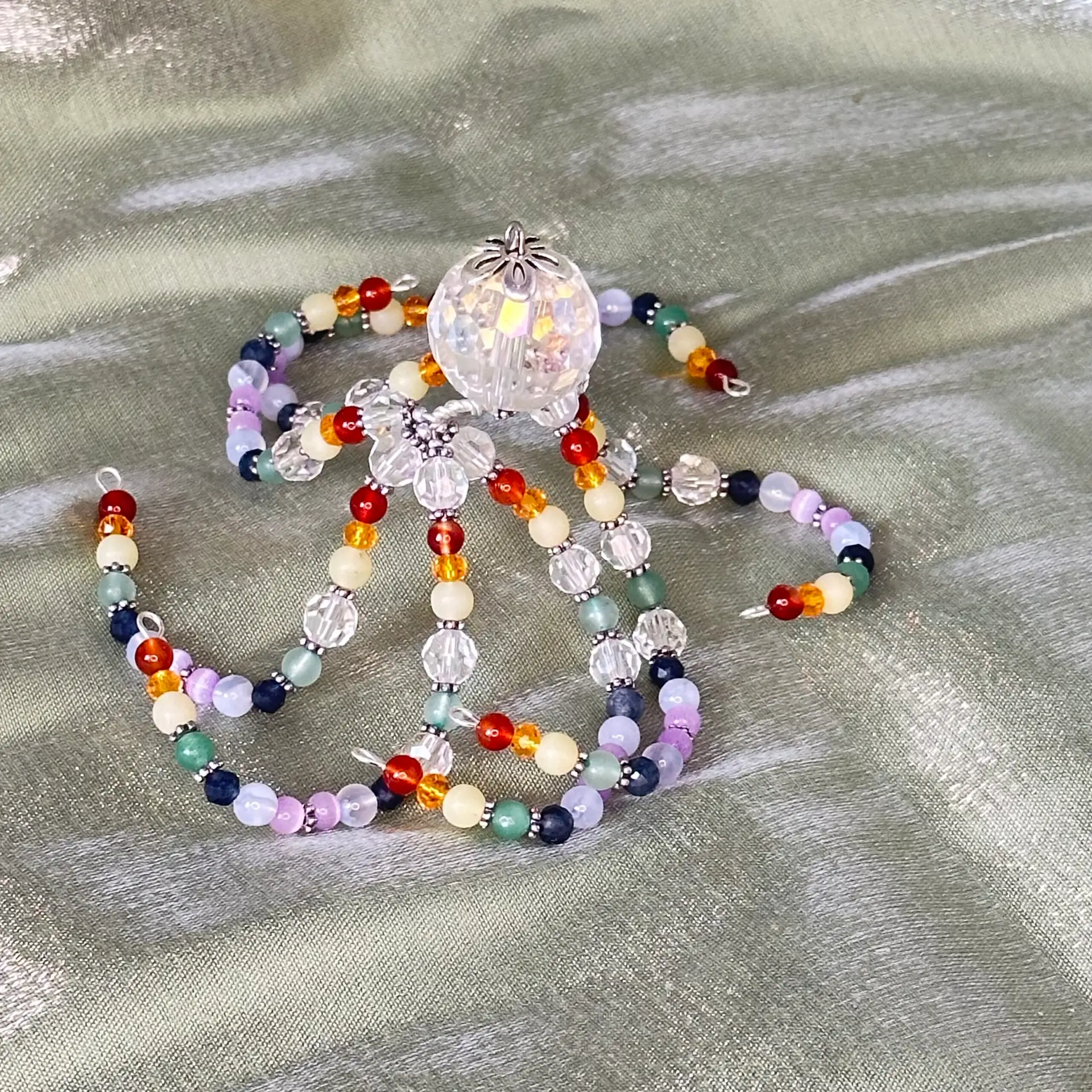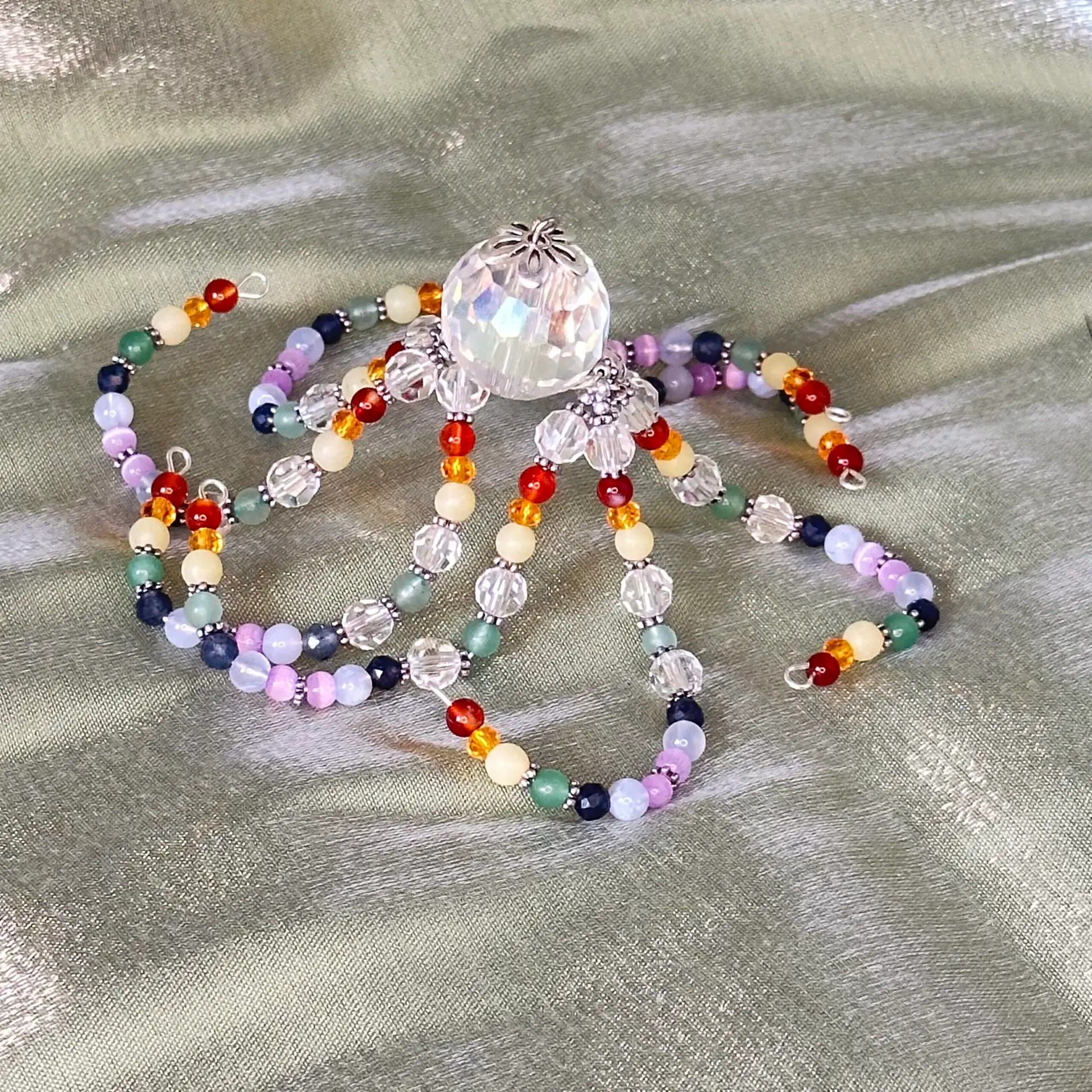 Celebrate your pride with Marsha P. Johnson. Let the legend of a drag queen, activist, and fighting spirit live on with this one-of-a-kind octopus. Various natural stone and glass beads make up her tentacles in a traditional rainbow pattern with a touch of flair.