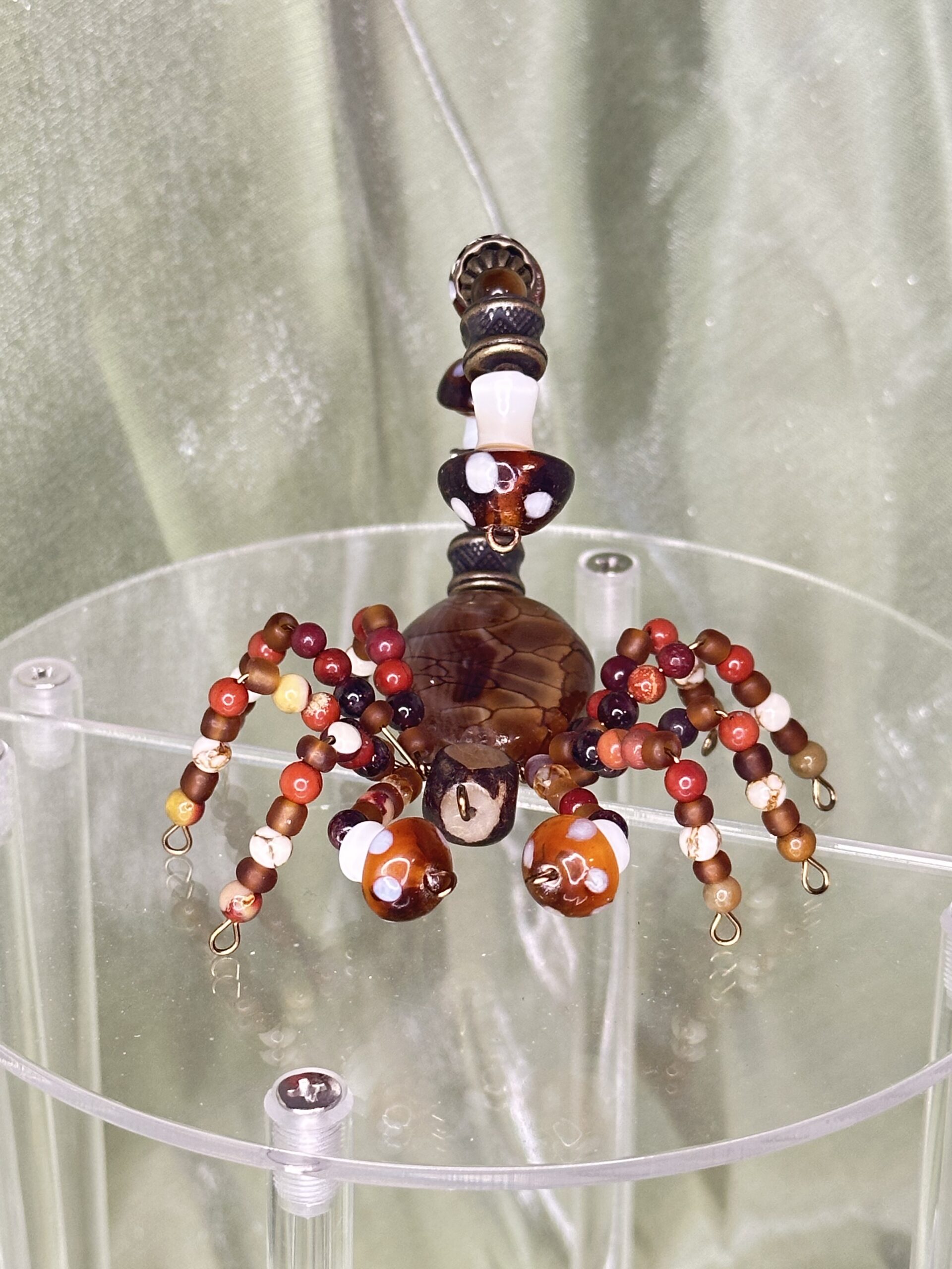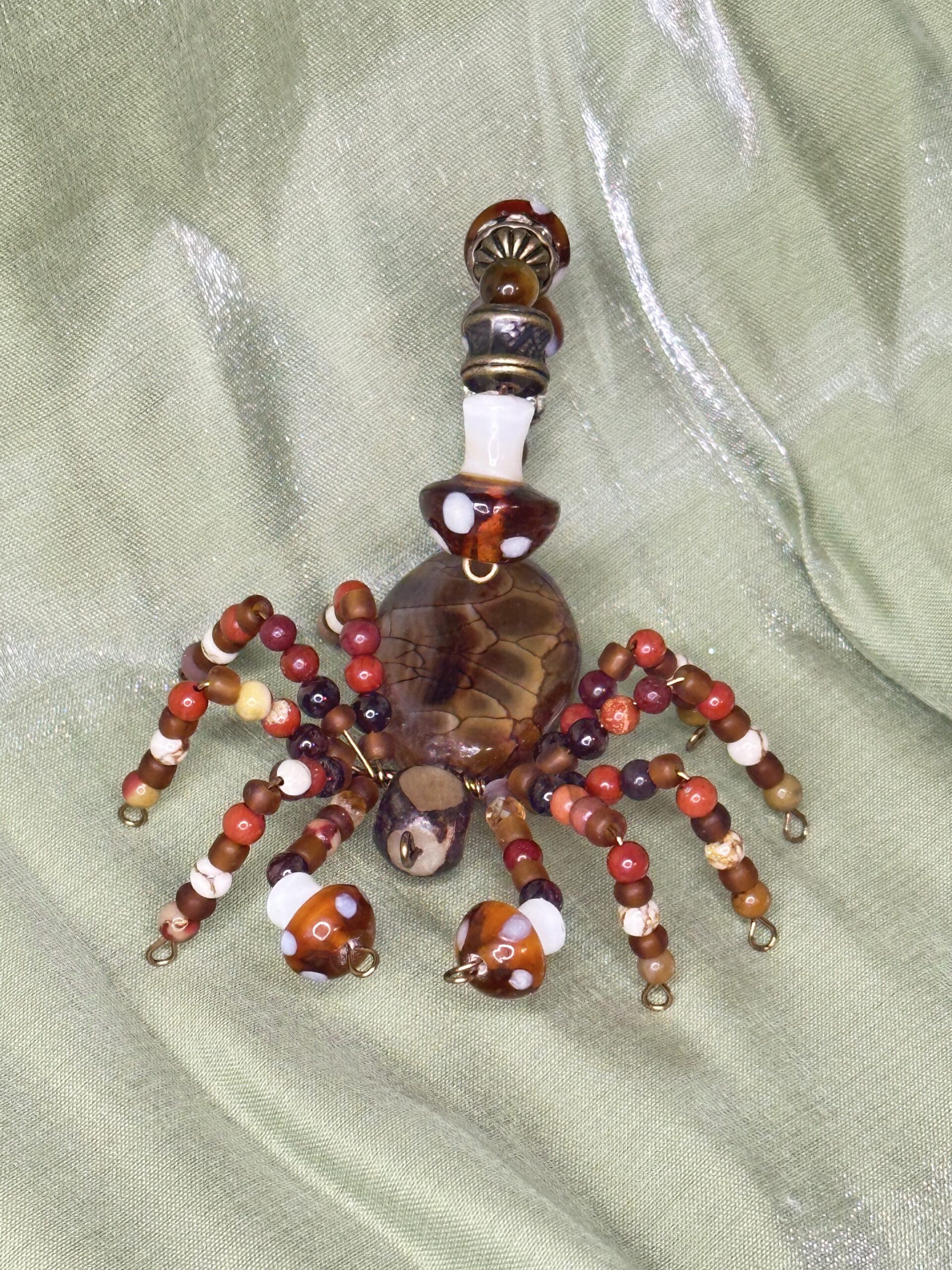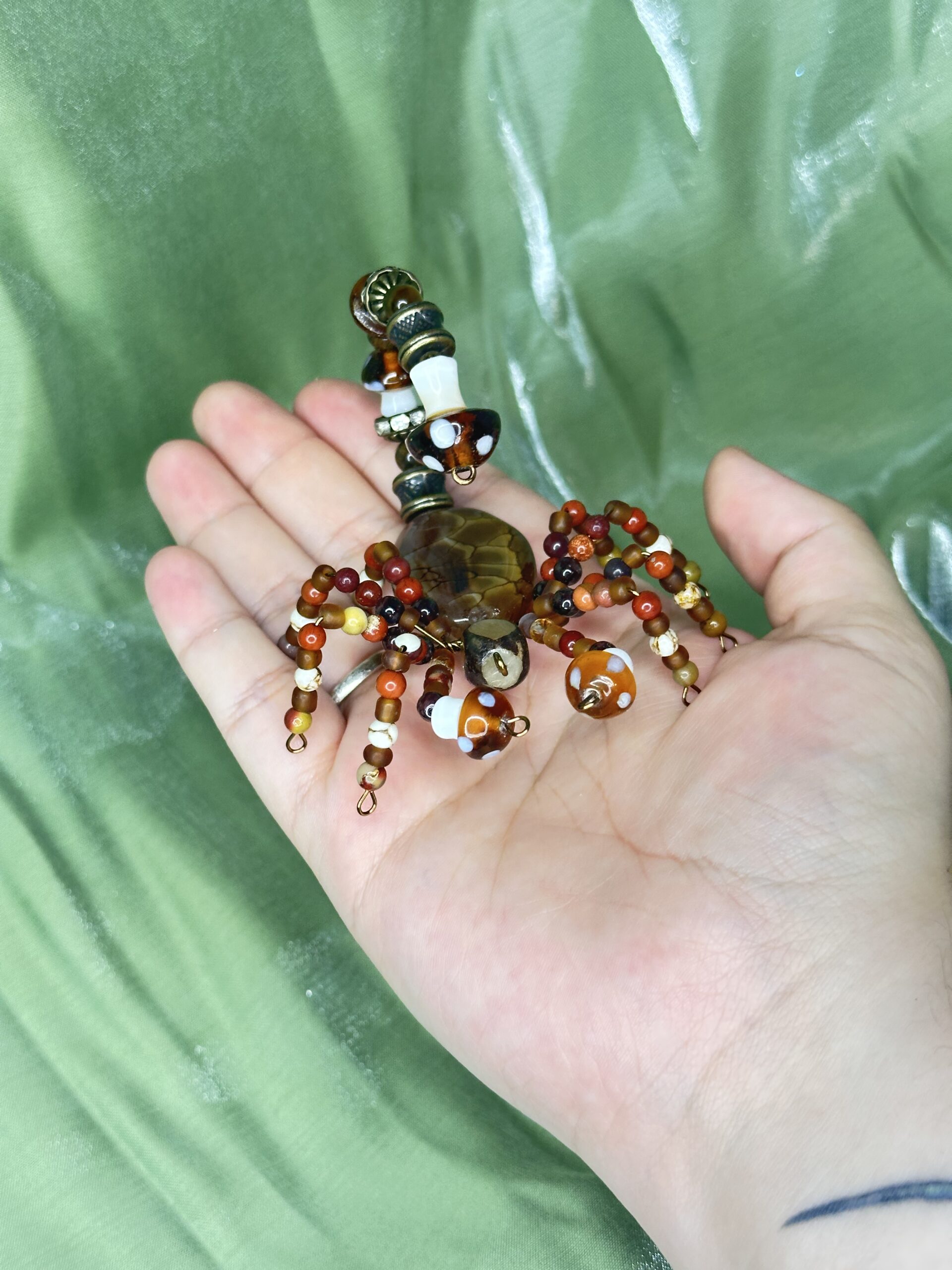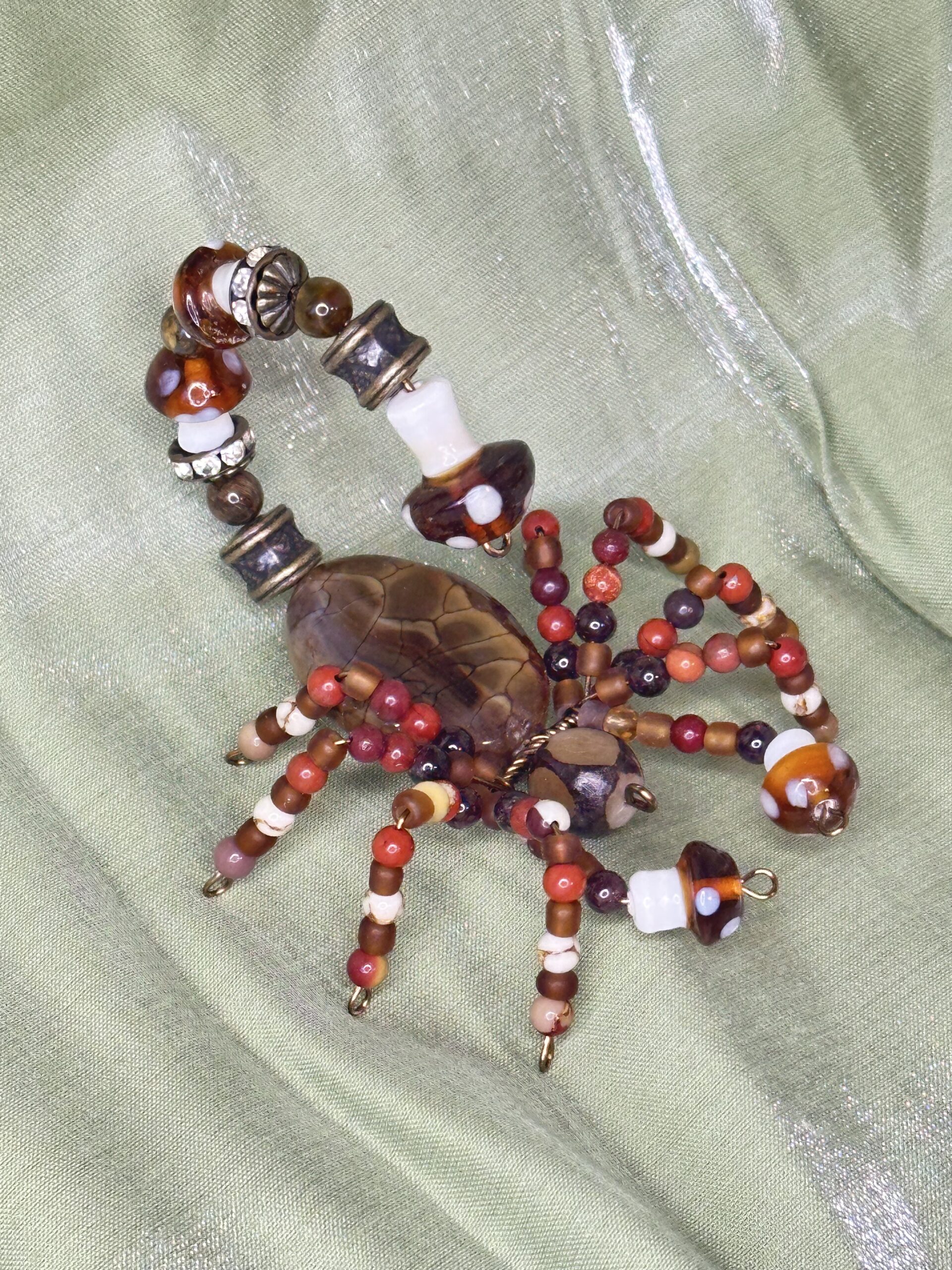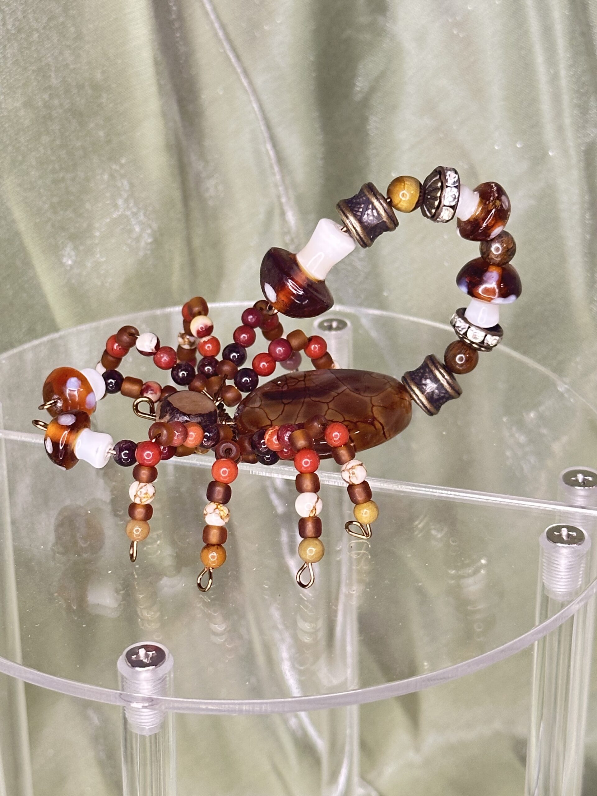 Meet Maude, the handmade beaded scorpion that merges artistry with whimsical charm. Crafted using intricate glass mushroom beads, golden pine jasper, mookaite, tiger’s eye, and agate, Maude is a unique piece that’s as captivating as it is impressive. Designed with rich brown tones accentuated by soft white inclusions, this scorpion brings a touch of warmth and creativity to your space. Let Maude spark conversations and infuse personality wherever it’s displayed.