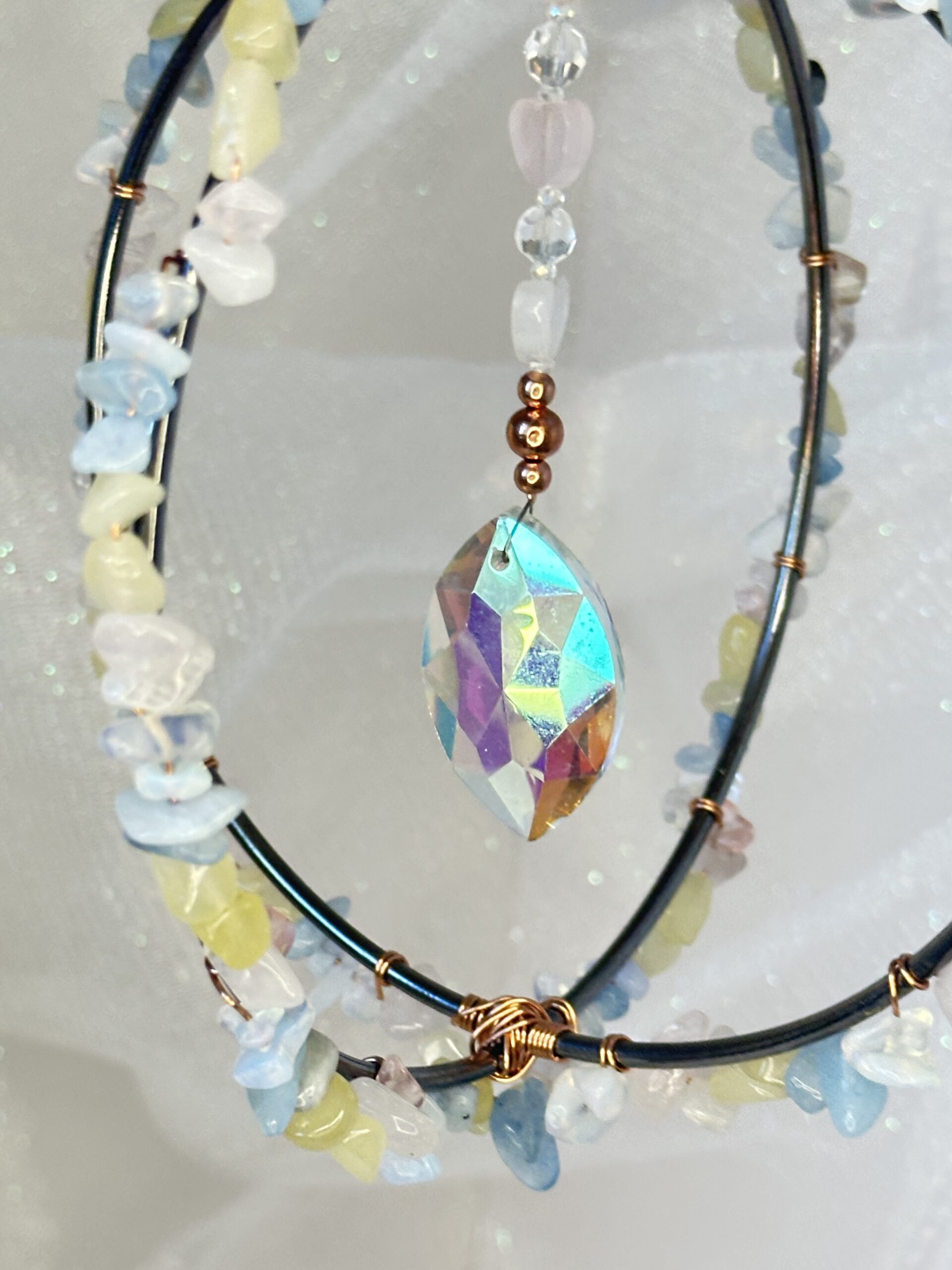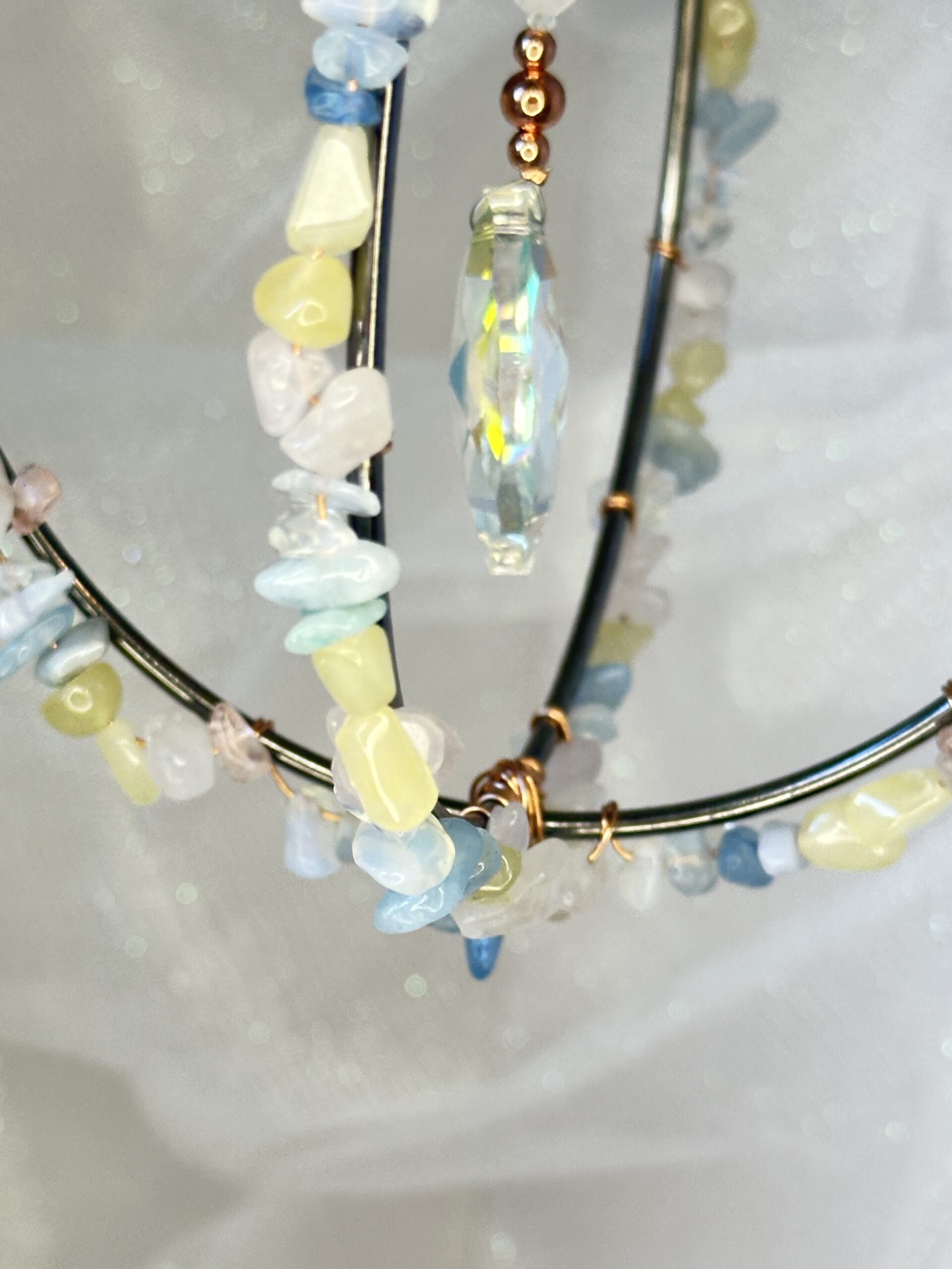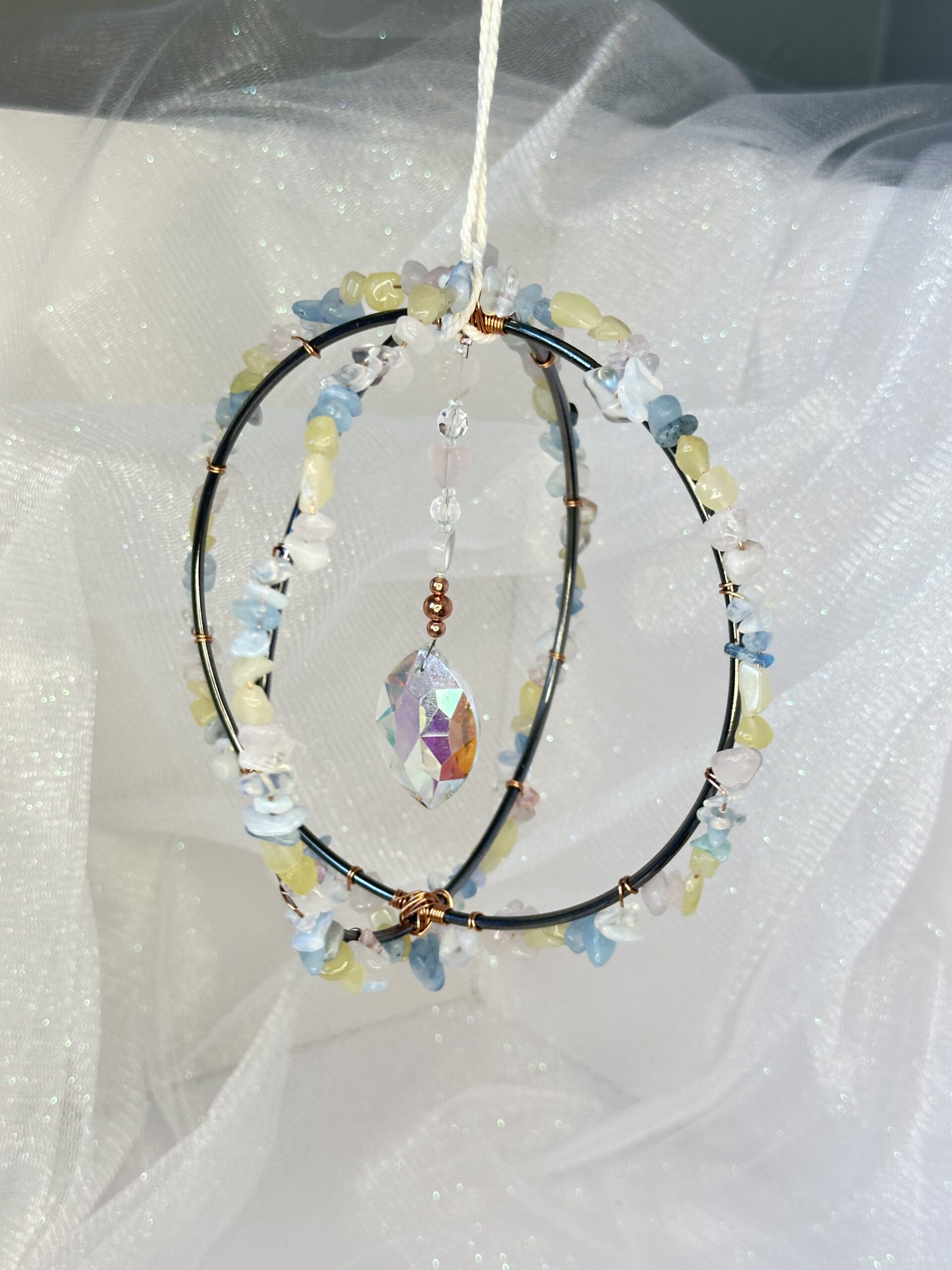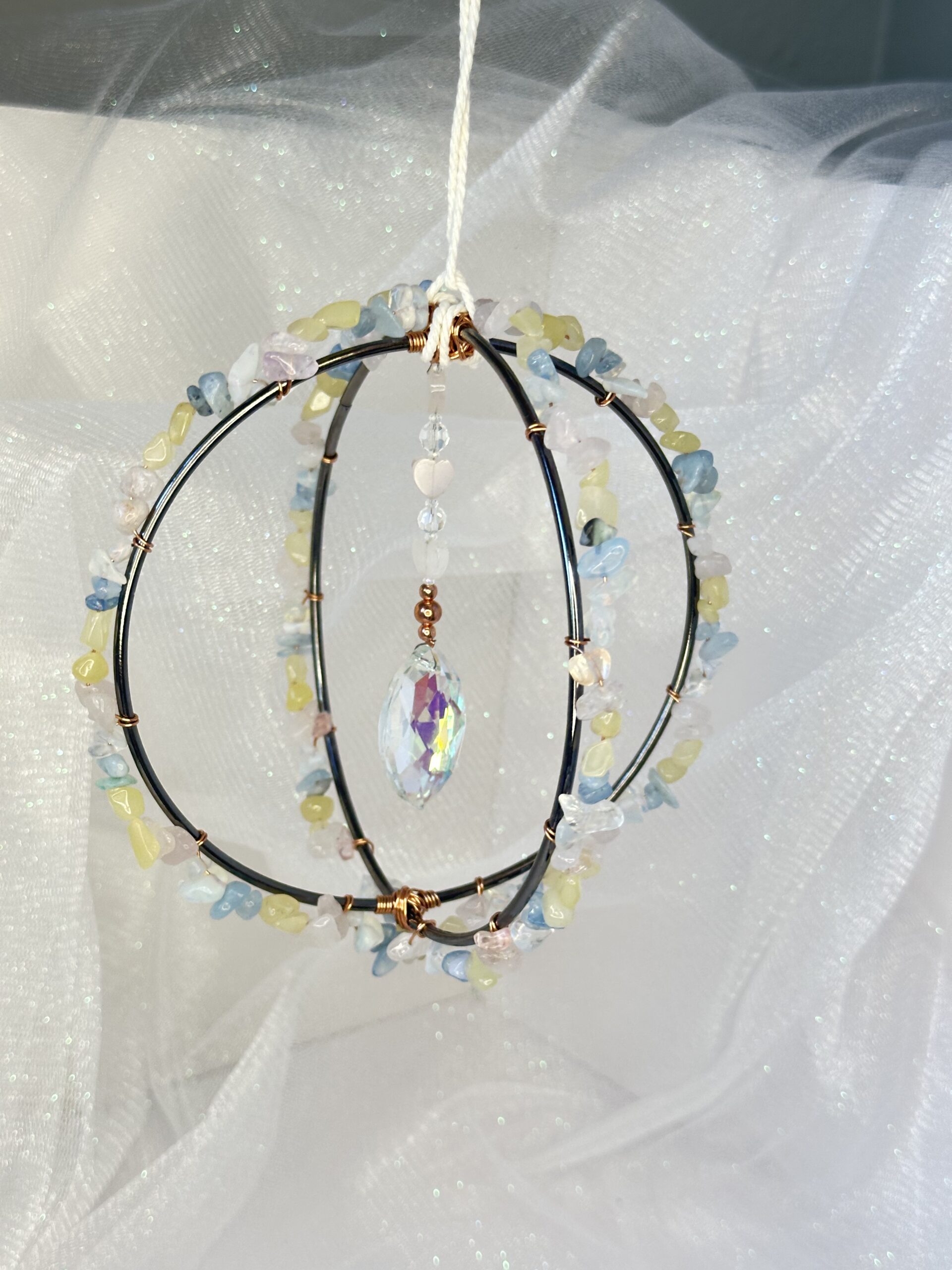 The soft, pastel hues of the stones beautifully contrast with the bold dark gray hoop and shimmering copper wire, creating a visually pleasing balance that exudes elegance. The interplay between texture and color gives the sun-catcher a dynamic yet soothing appearance, perfect for complementing a variety of interior styles. Every detail, from the layering of morganite chips to the hand-wrapped copper wire, reflects an artisan touch that makes this sun-catcher a one-of-a-kind treasure.