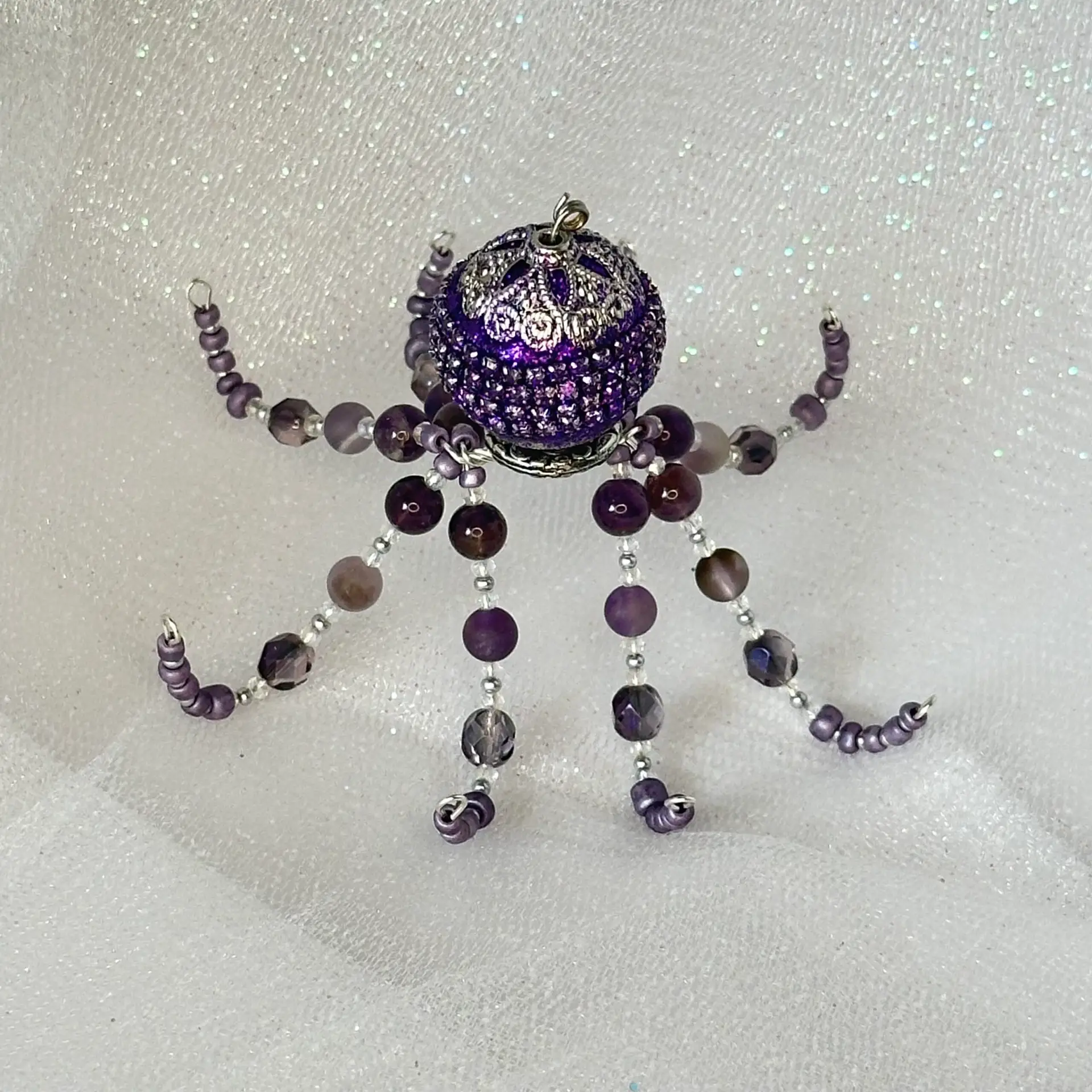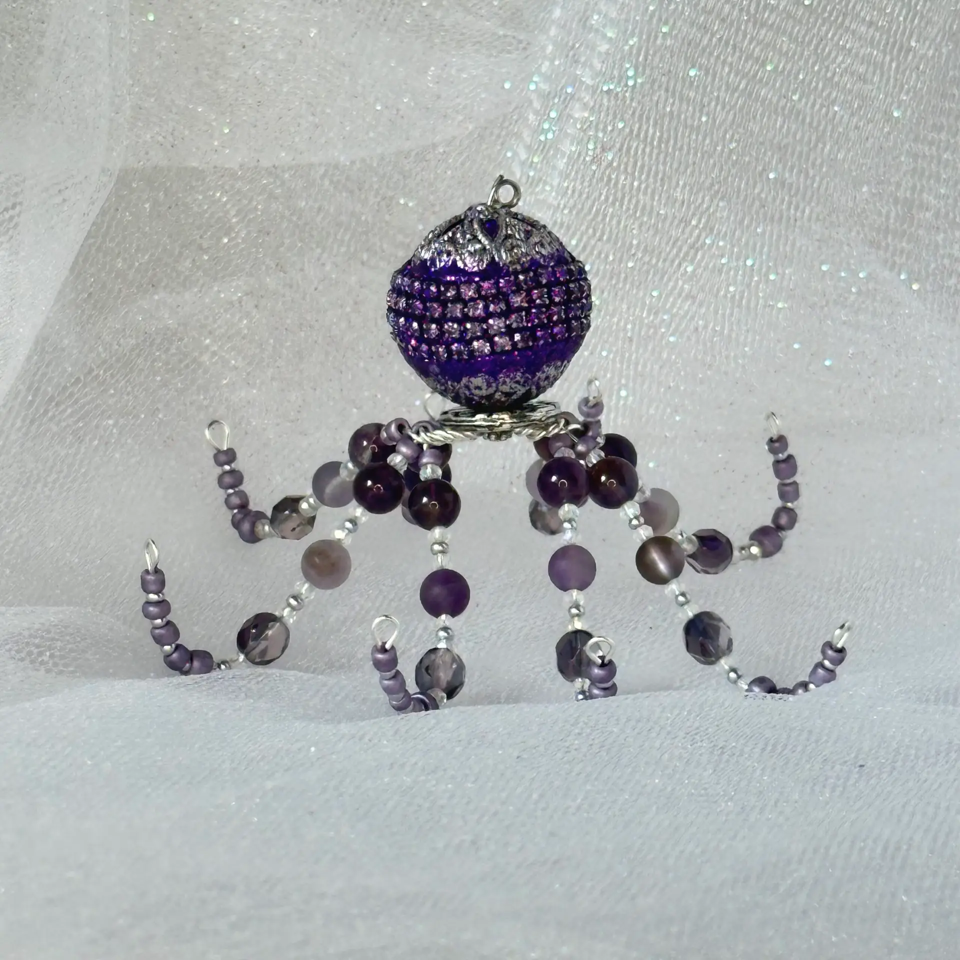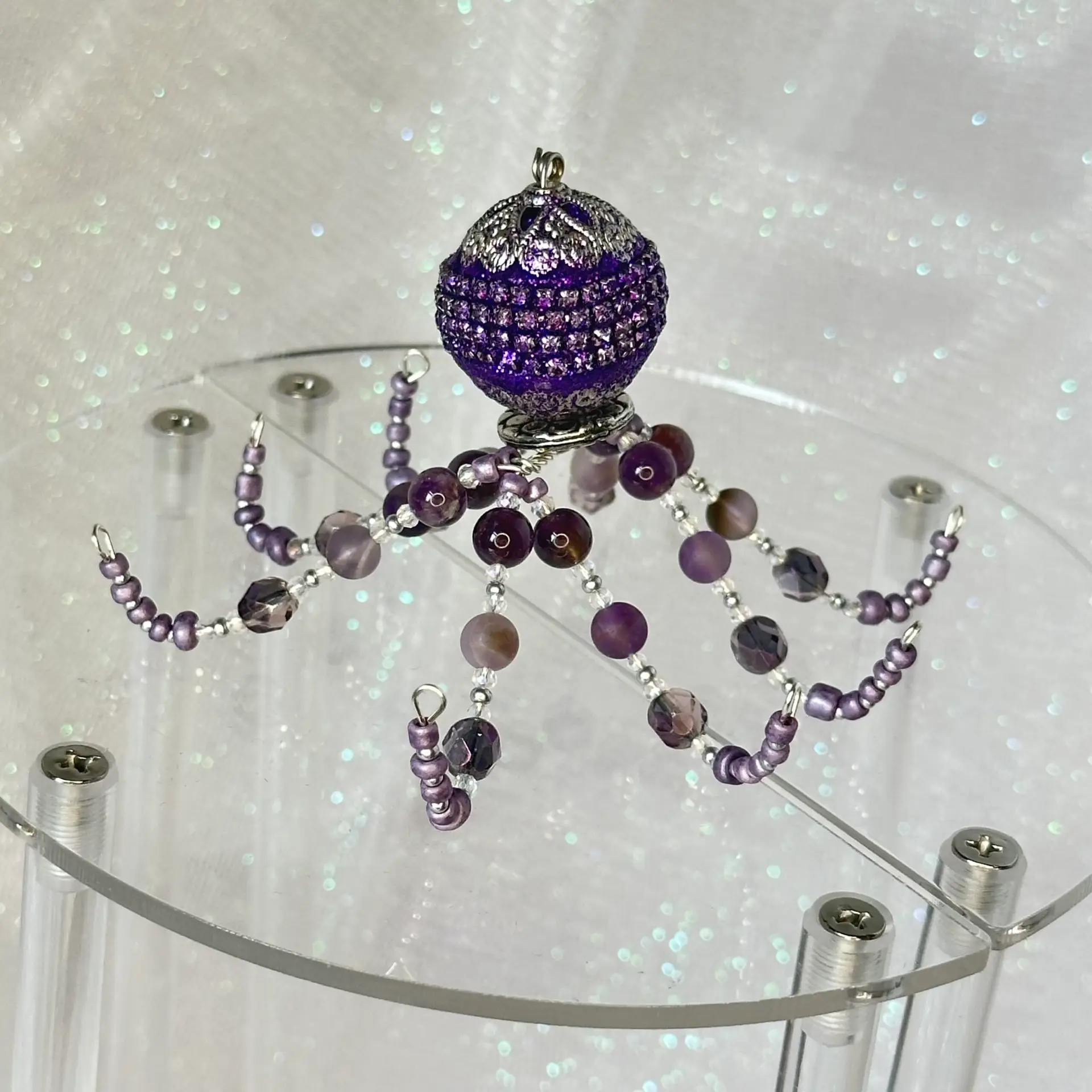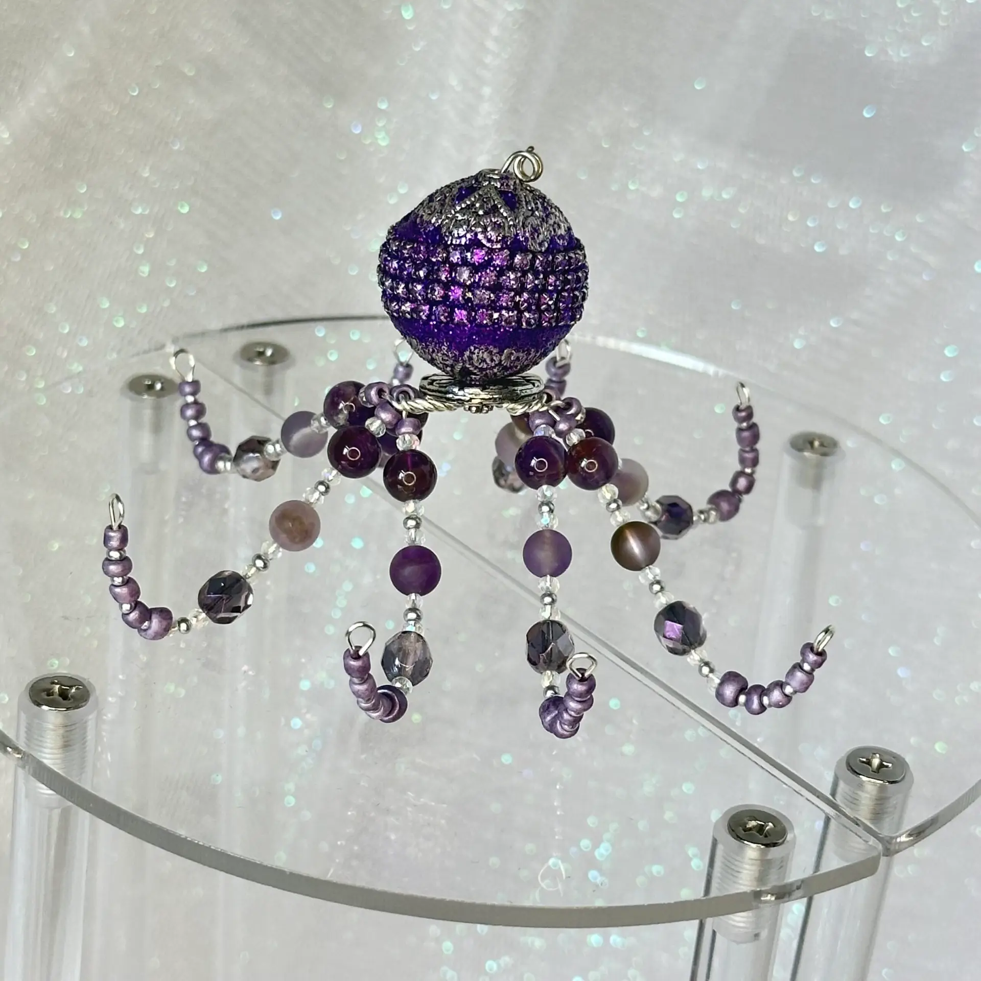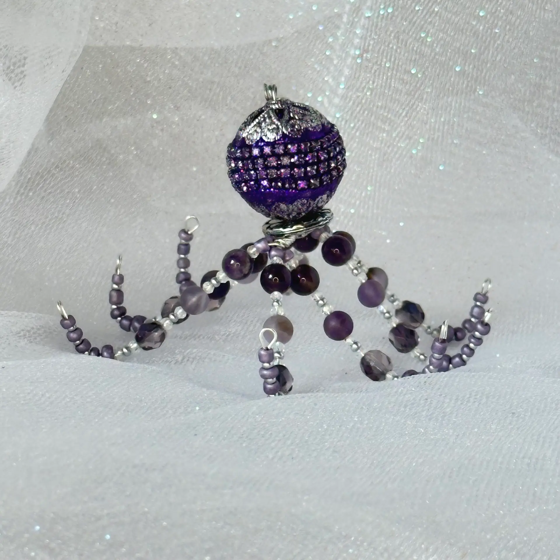 Ophelia came out from the coral reef to say hi! Made of both polished and matte amethyst beads, Ophelia would make a great gift for anyone born in February or anyone who just loves the color purple. Ophelia is a great listener and work helper, so she would fit great on your desk or nearby shelf to help you through the hard days where you feel like you could use a few extra hands (or… tentacles)!