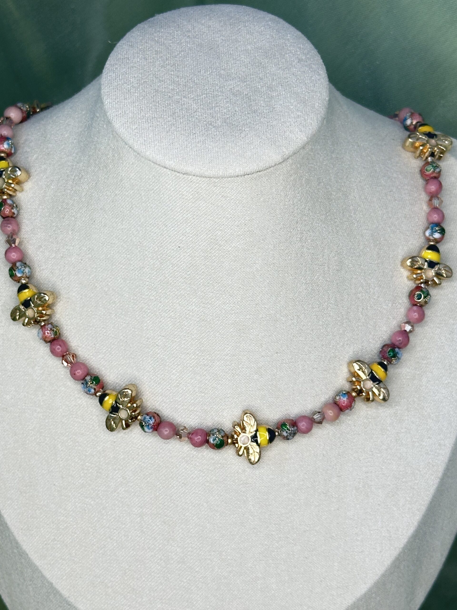 Discover a one-of-a-kind accessory that combines elegance, artistry, and a love for nature. This handmade beaded necklace is the perfect statement piece to amplify your style. Measuring 17 inches, it offers a comfortable fit while showcasing a harmonious blend of premium materials, including rhodonite, cloisonné, crystal, and metal bee beads. Every detail is thoughtfully designed, giving each bead its chance to shine.