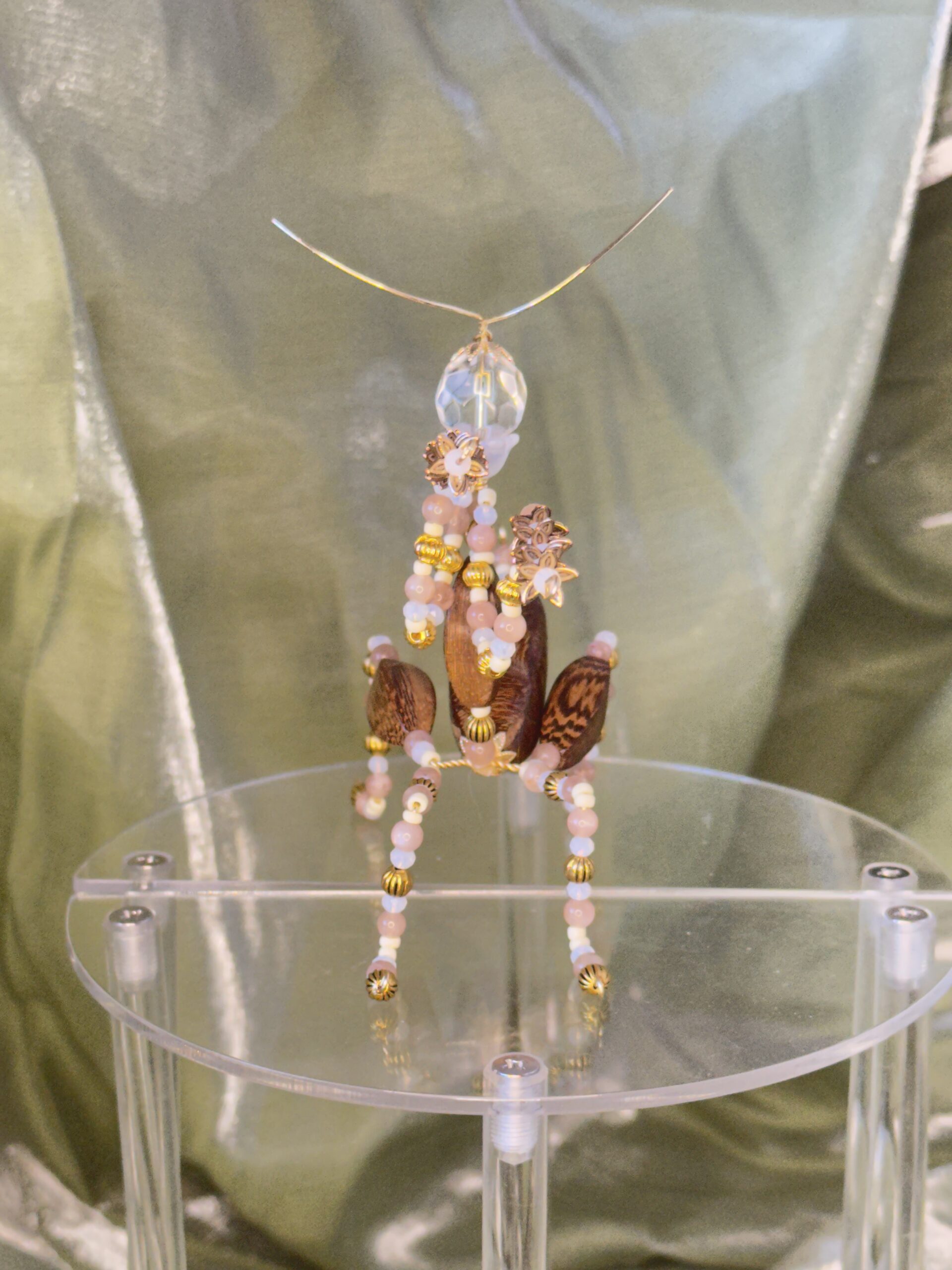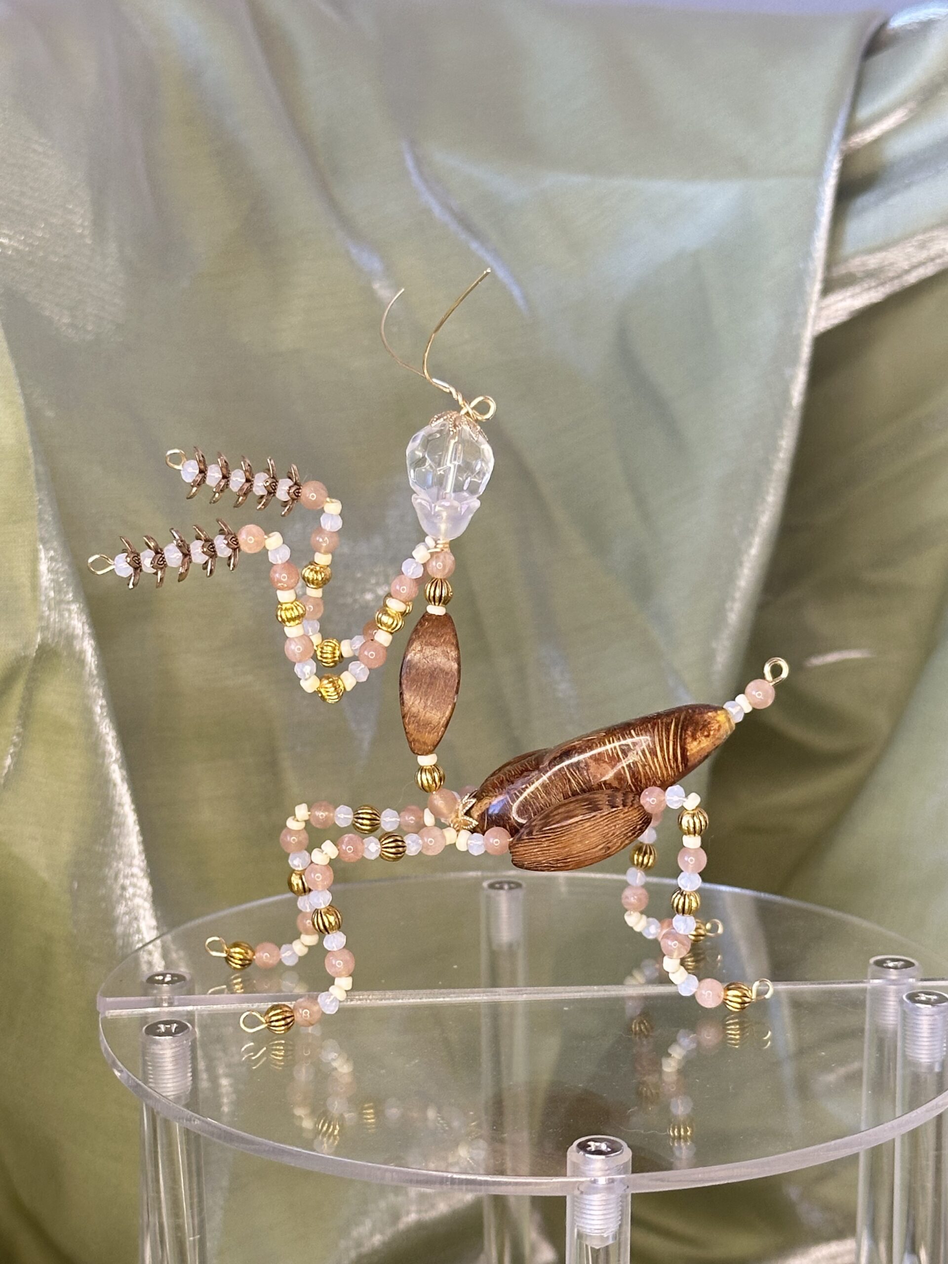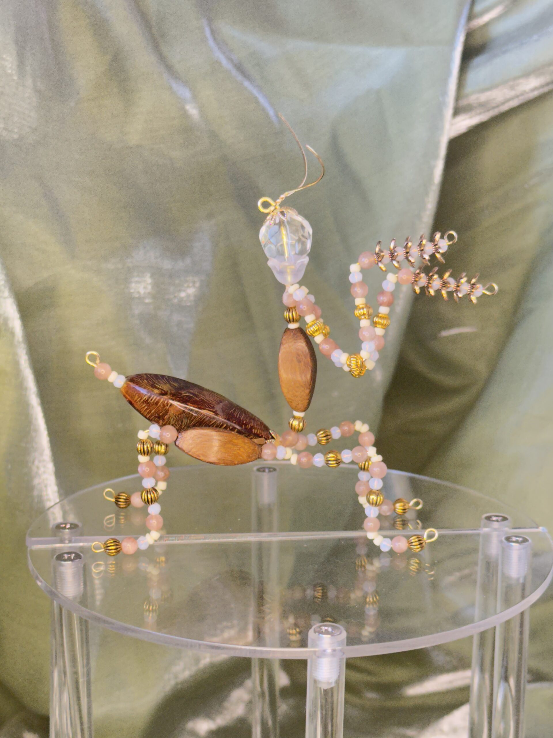 Quinn is a truly captivating decorative piece, designed to bring charm and warmth to any environment. This feminine mantis is adorned with opalite Chinese faceted crystal and natural sun-stone that flashes beautifully in the light, creating an ethereal glow to brighten your day.