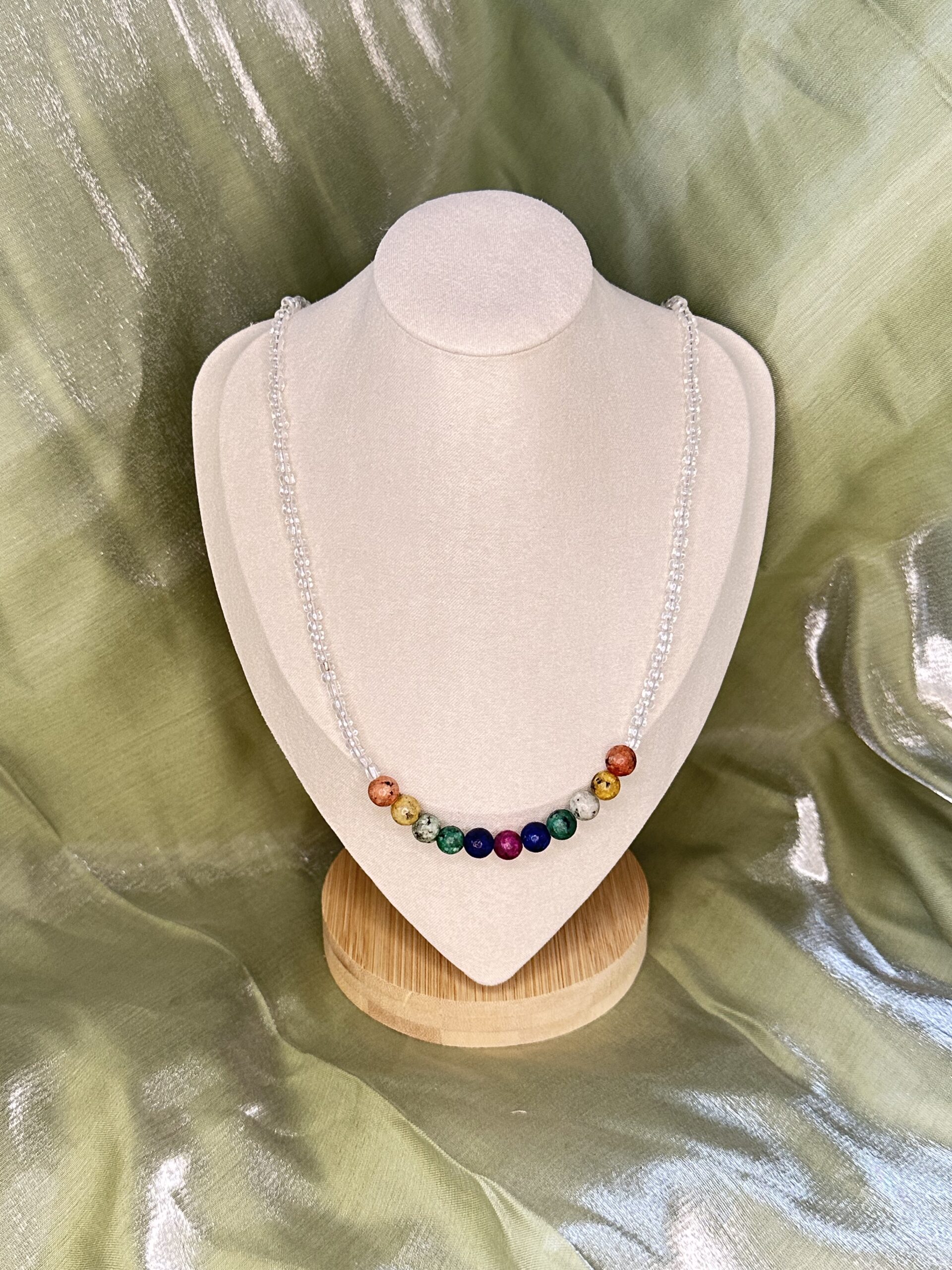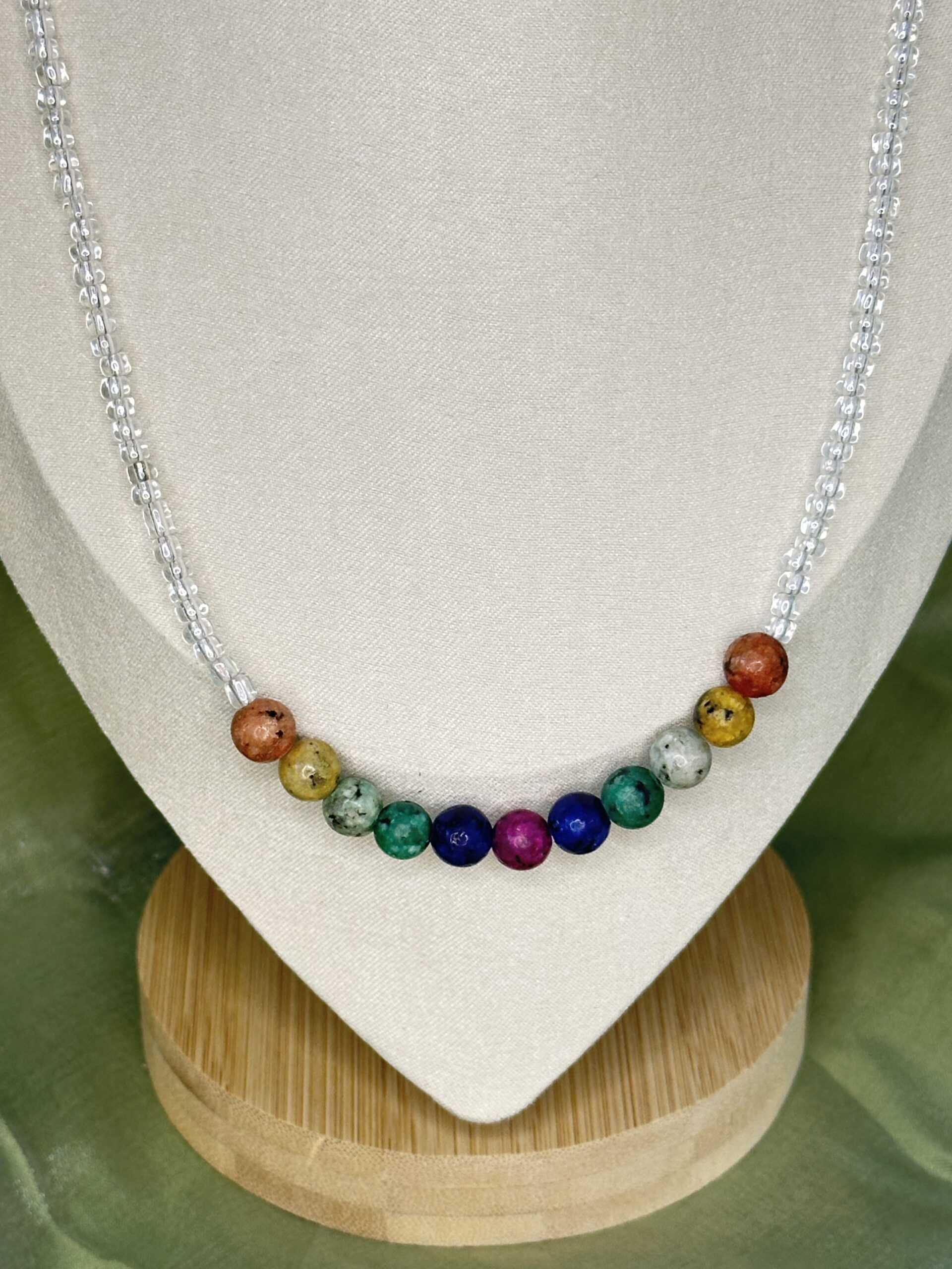 Celebrate the beauty of nature with our Handmade Rainbow Granite Necklace, thoughtfully designed to bring color and joy into your wardrobe. This exquisite piece is meticulously crafted using dyed granite beads, each featuring a stunning rainbow-like pattern. Paired with shimmering glass beads, the design radiates elegance and vibrancy, perfect for anyone who loves the full spectrum of colors or wants to make a stylish statement.