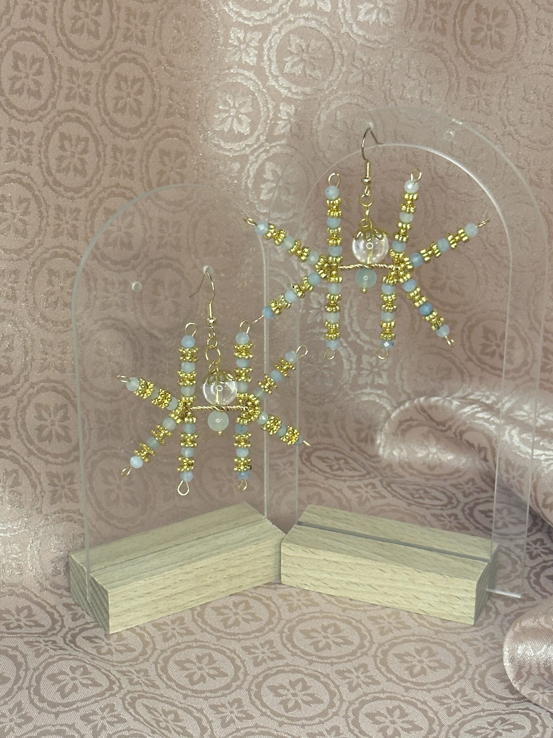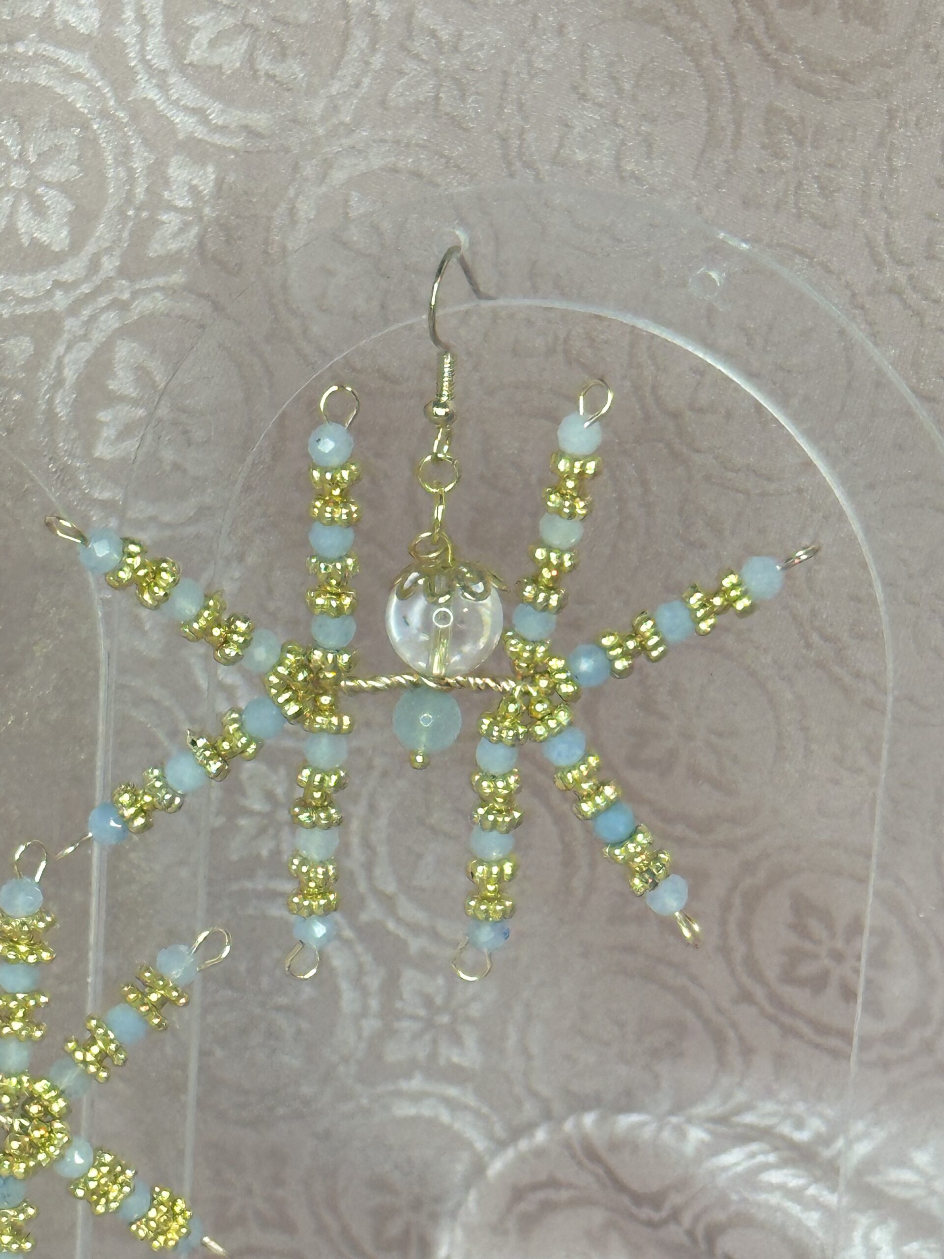 Introducing Sugar and Spice. These ladies certainly know how to make an entrance. Perfectly designed for occasions where making an impression is paramount, these earrings embody exceptional craftsmanship. Adorned with quartz and aquamarine beads, the delicate touches bring a shimmering and ethereal quality to their design. While their bold aesthetic is captivating, their heavier nature makes them ideal for occasional wear, ensuring comfort throughout your special event. Embrace the opportunity to express your individuality and stand apart with these unforgettable spider-inspired earrings.