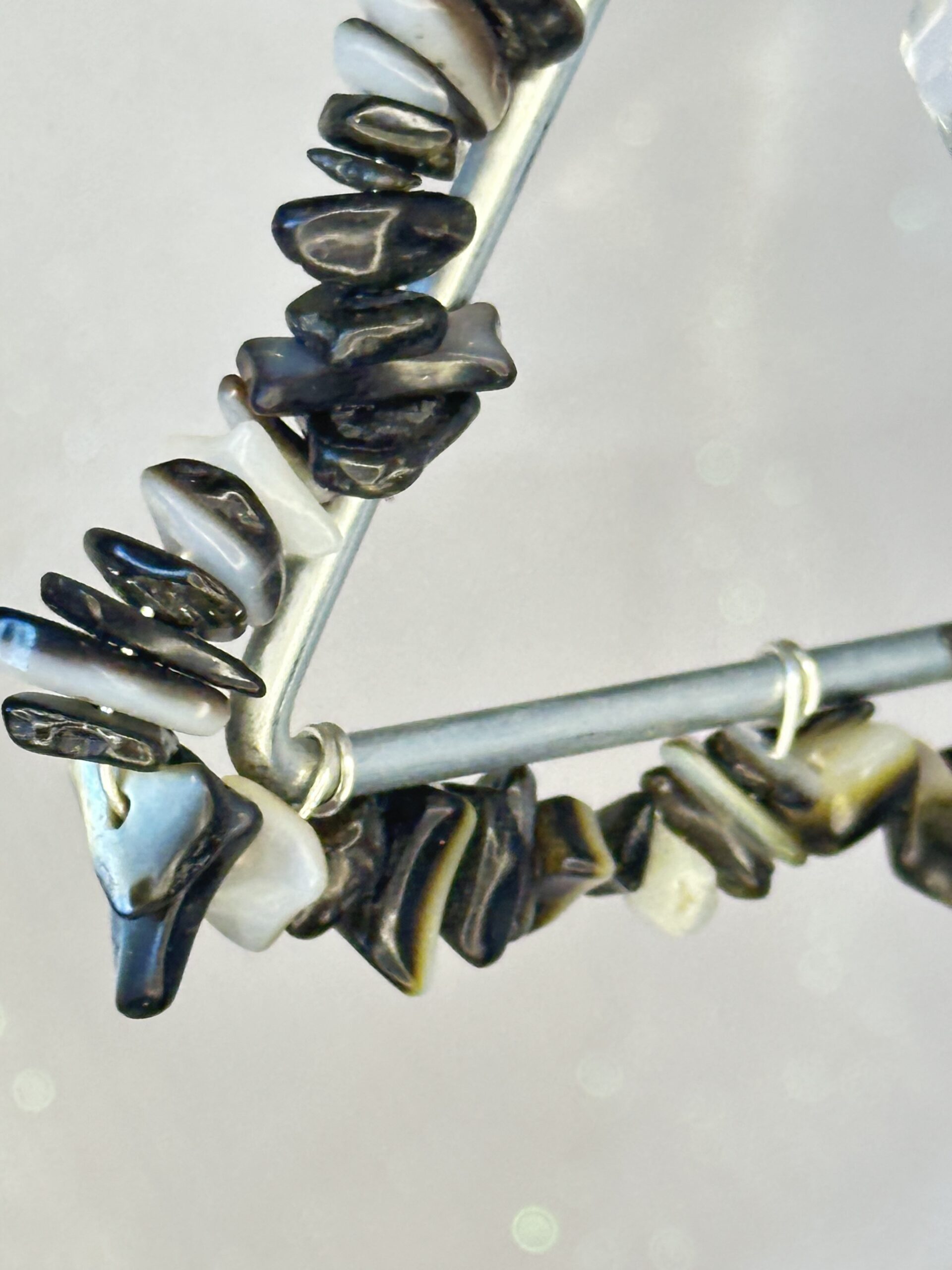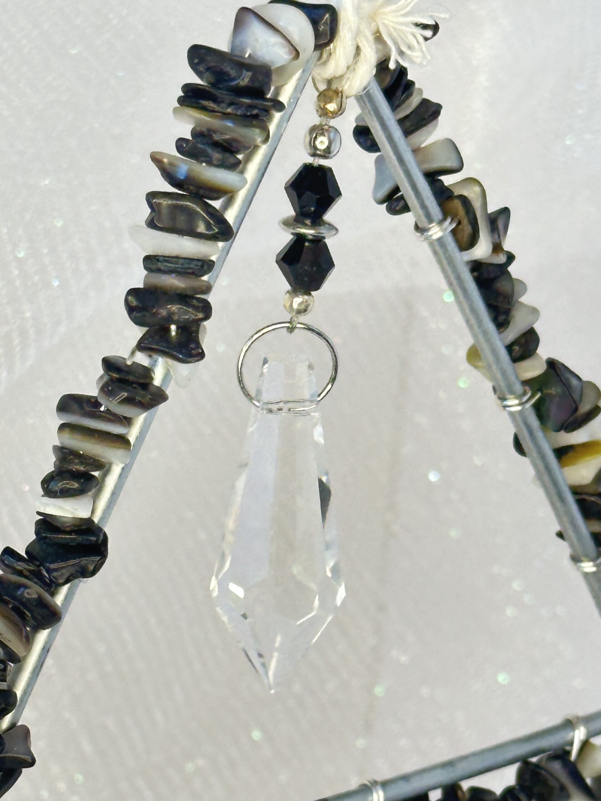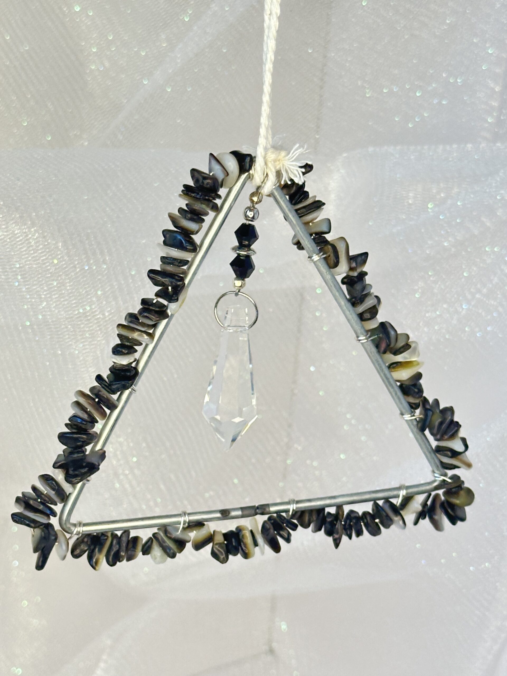 Transform your space with the Handmade Triangle Sun-Catcher, designed to infuse any setting with a touch of refined charm. Crafted using exquisite Tahitian shell chips and adorned with a faceted glass pendant, this unique piece boasts elegant black and white colors that seamlessly integrate with a wide range of aesthetics. Whether you’re looking to bring some sparkle to your home or brighten up your car’s rear-view mirror, this sun-catcher provides the perfect solution.