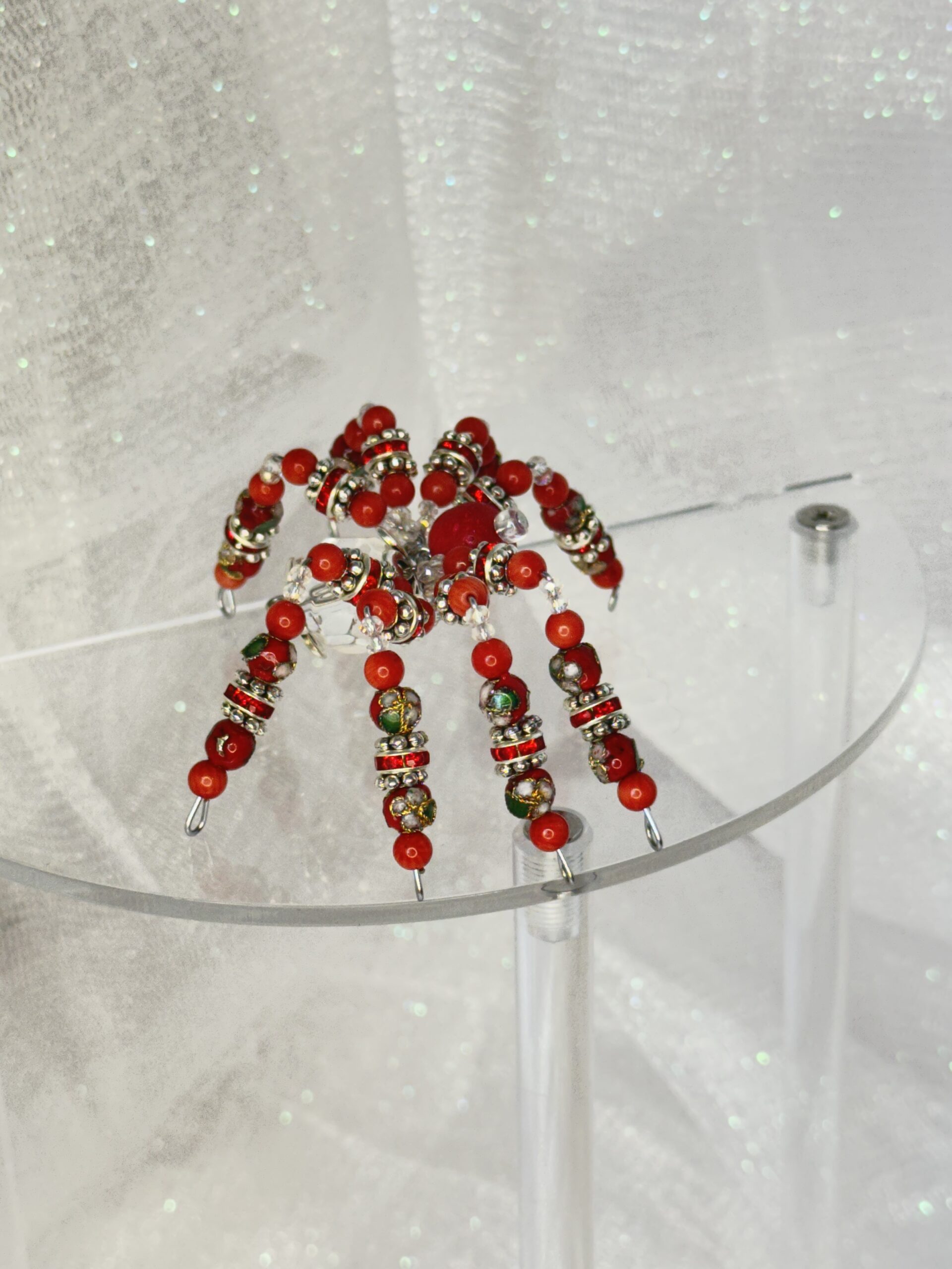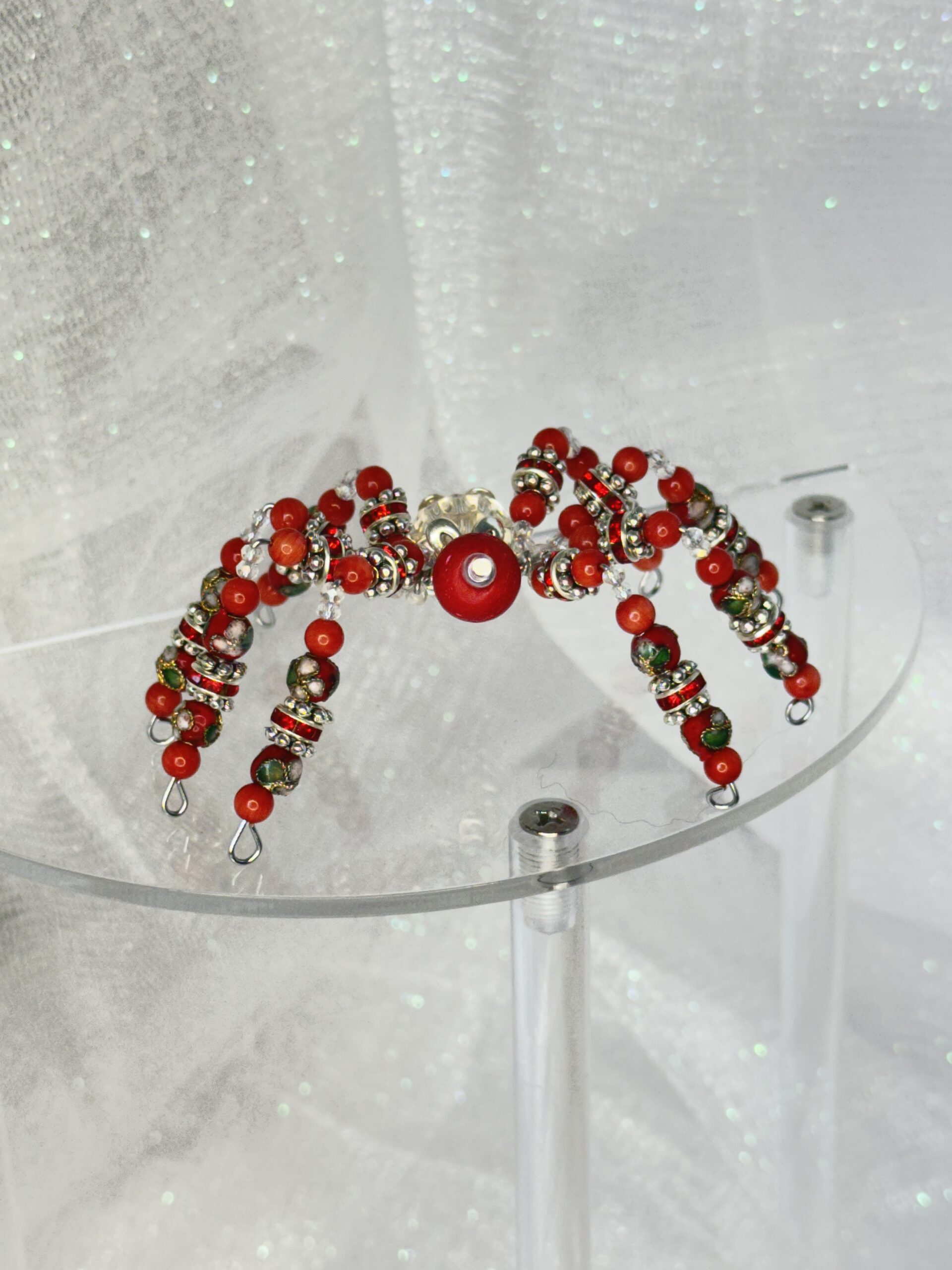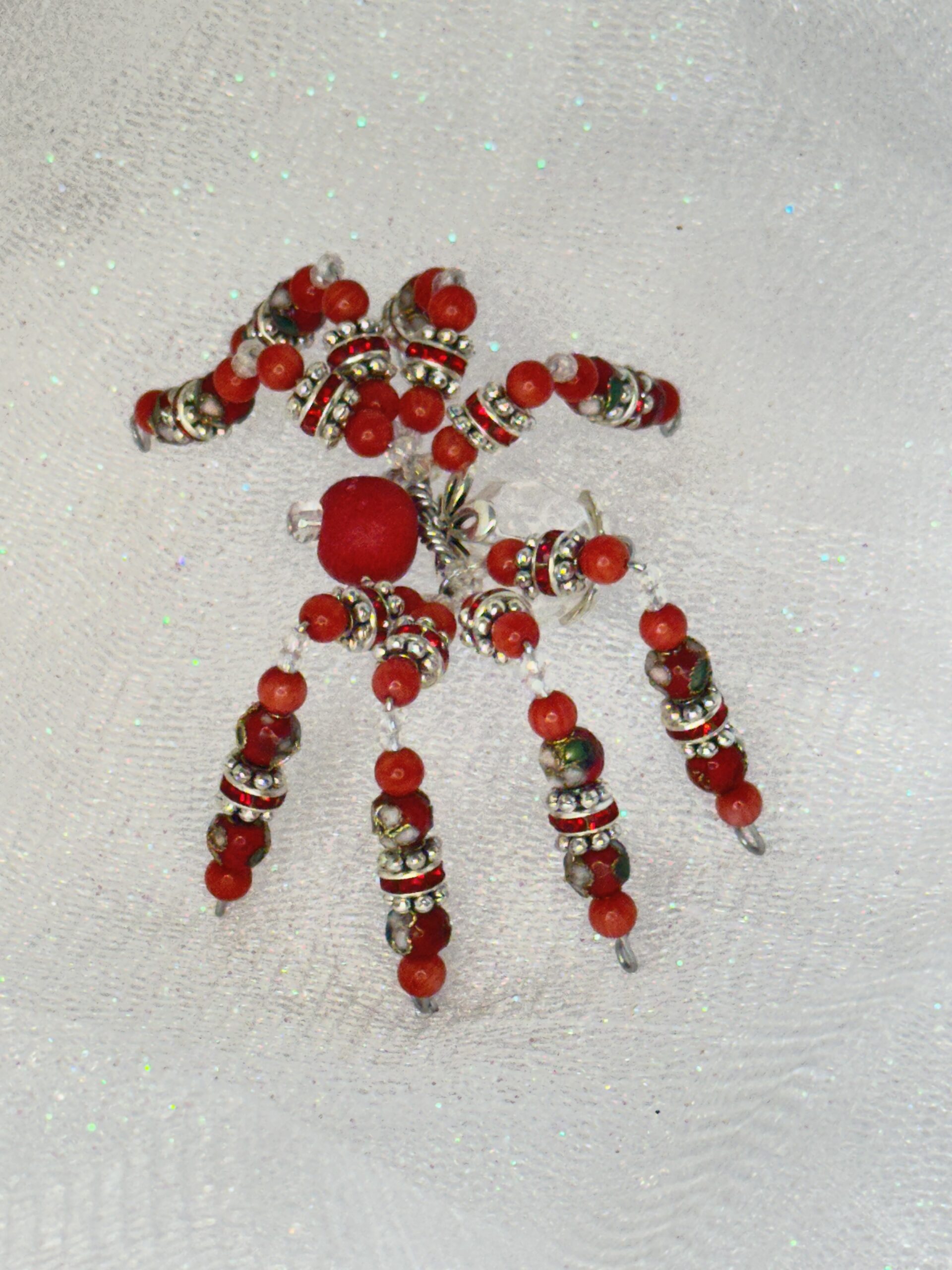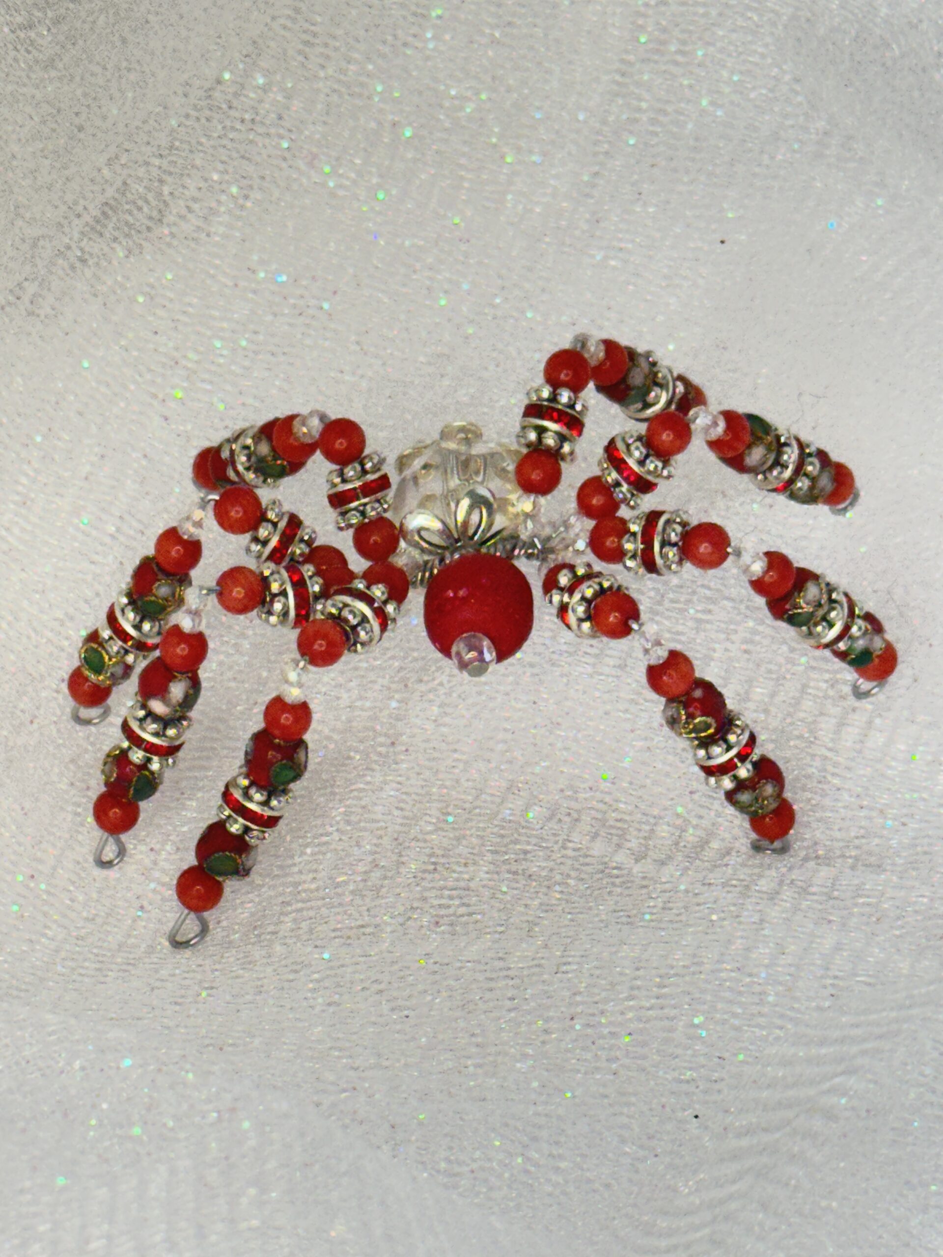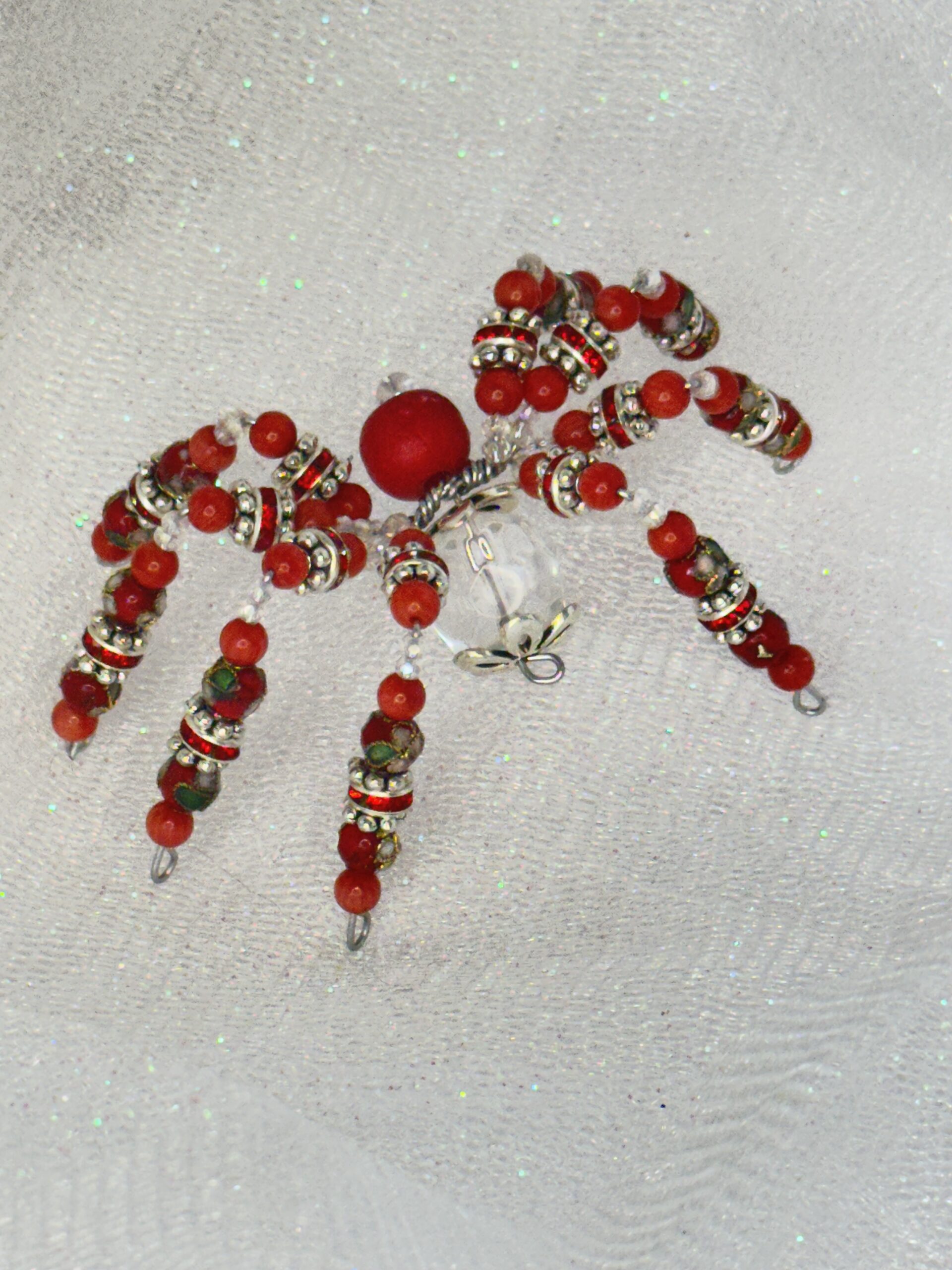 Meet Winifred, the handmade beaded spider that’s guaranteed to add a splash of character to your space. This bright red and clear creation is meticulously crafted using bamboo coral, cloisonné, bone, faceted crystal, and metal beads. Designed with durability and beauty in mind, Winifred is not your average decor item. Place her on a desk, shelf, or car dashboard to brighten up your daily routine with her charm. Feeling festive? Winifred can be hung like an ornament on your Christmas tree or rear-view mirror, adding a touch of handmade elegance to your personal space. Searching for a memorable, handmade gift? Winifred makes the perfect option for anyone who appreciates unique craftsmanship and fun design. And don’t forget – she’s on sale, making her an irresistible pick for adding a personal, artistic touch to your decor or gifting needs.